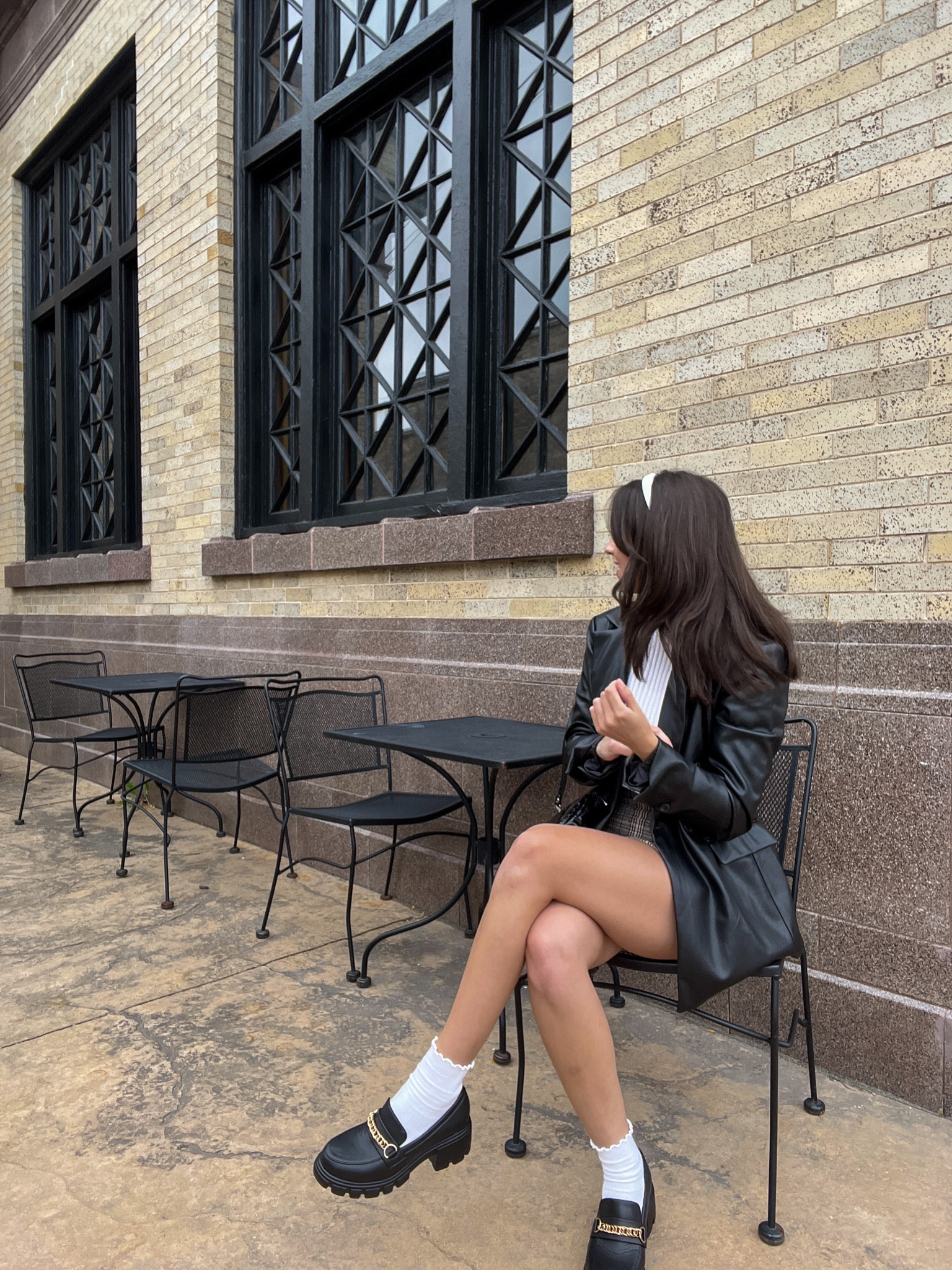 The combination of a structured leather jacket and a simple dress creates a striking balance between edgy and feminine, while chunky loafers with white socks add a playful, trendy twist to the overall look. The monochromatic palette exudes sophistication and makes the ensemble versatile for various occasions.
