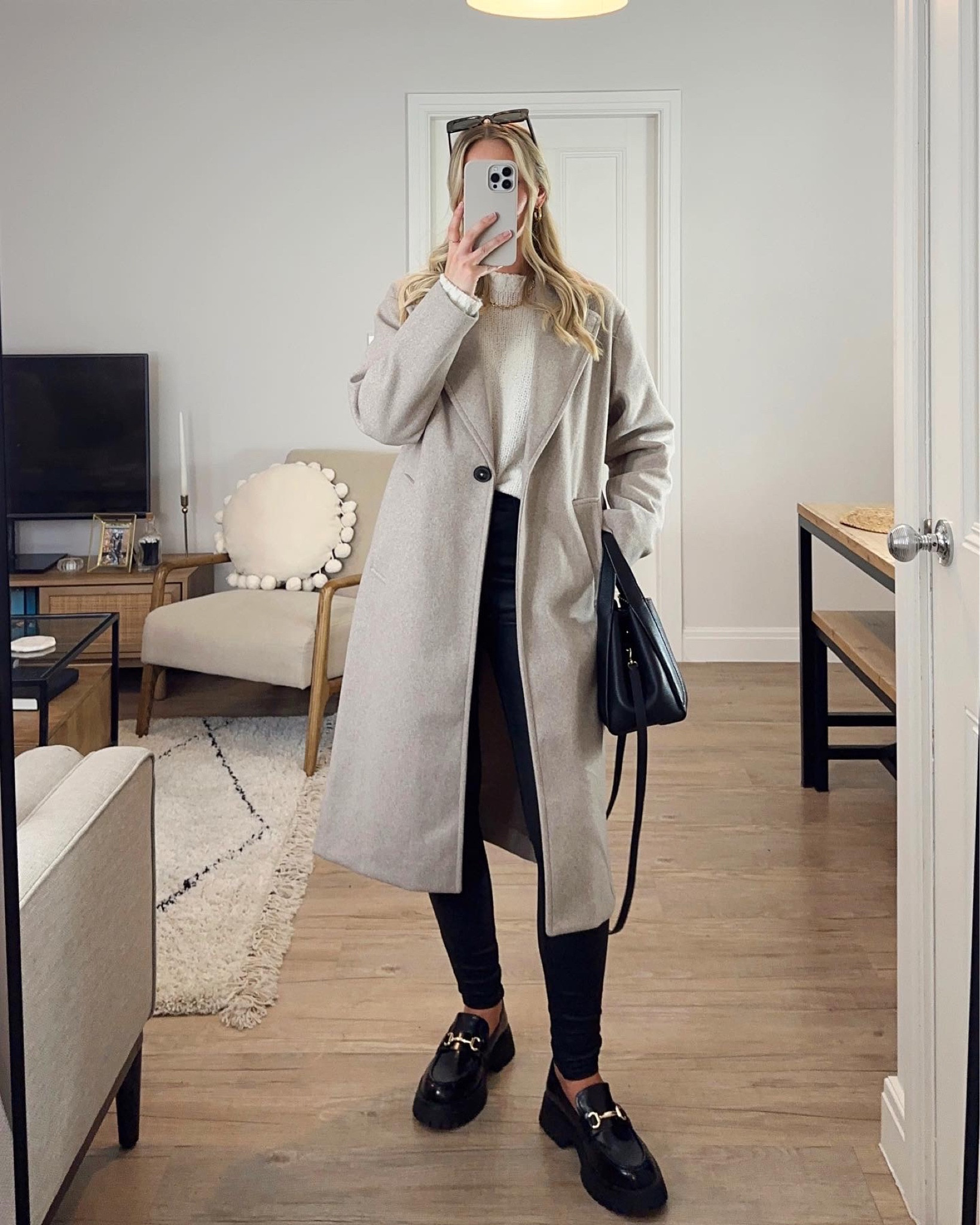 The classic color palette of this ensemble exudes elegance, while the tailored coat adds a touch of sophistication. The outfit’s streamlined silhouette is both chic and functional, perfect for a polished everyday look.