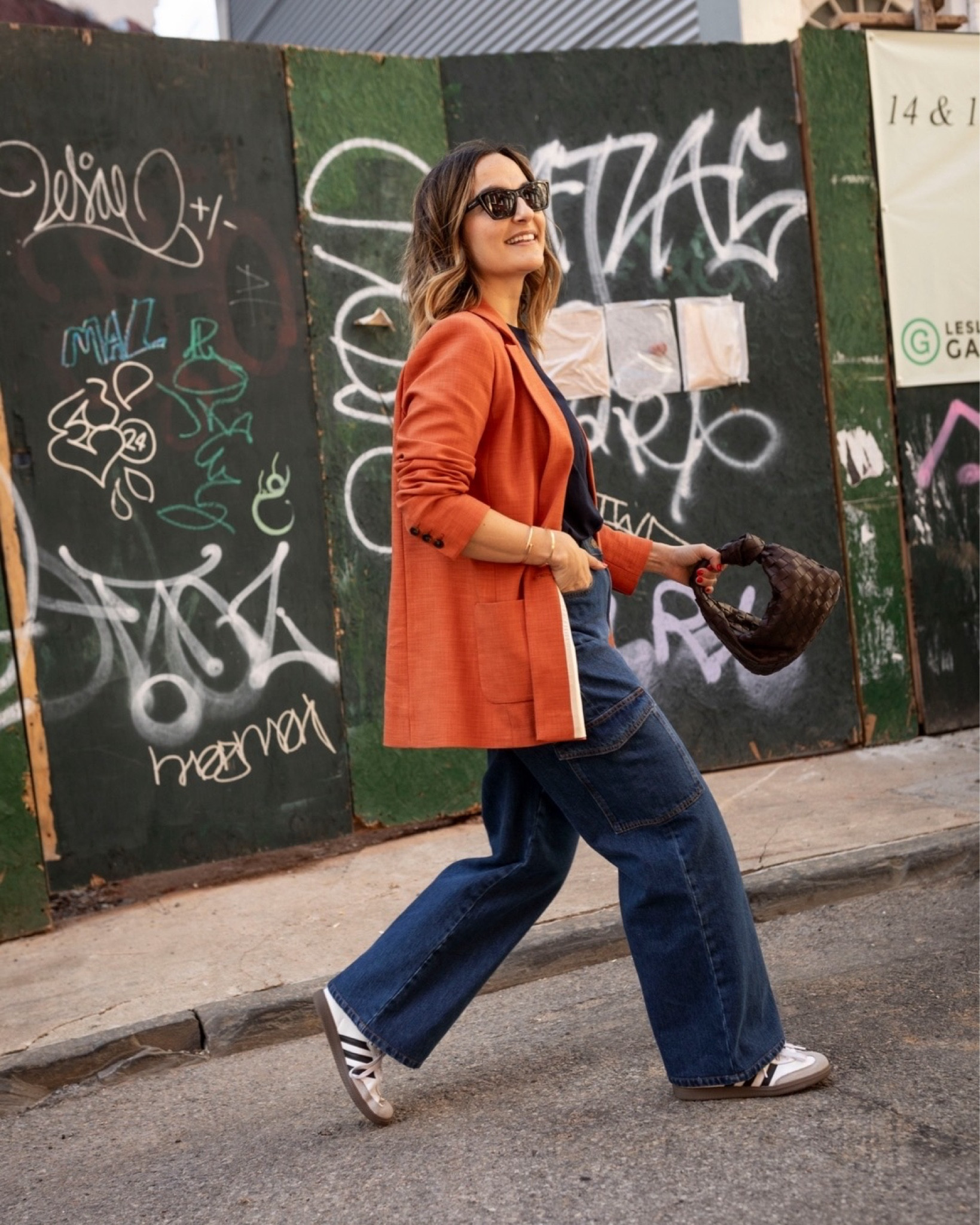 This ensemble strikes a fantastic balance between casual chic and sophistication; the earthy tones of the blazer paired with classic denim create a timeless look. The choice of simple white sneakers adds a touch of effortless style, perfectly blending comfort with fashion-forward sensibility.
