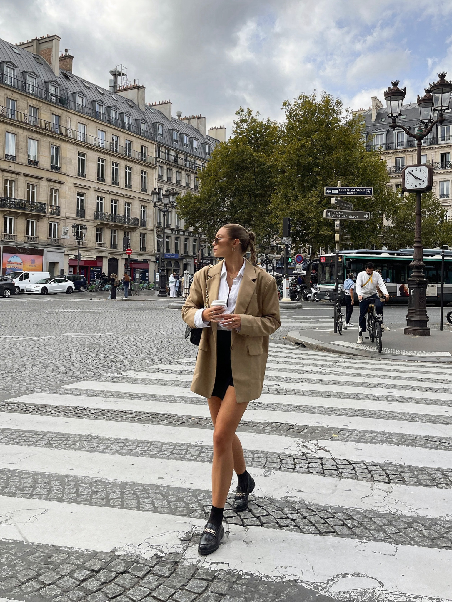 The oversized blazer teamed with a crisp white shirt exudes a sophisticated yet casual vibe, while the black mini skirt and loafers add a classic, preppy touch that’s both stylish and timeless. The ensemble strikes the perfect balance between professionalism and playful charm, making it a versatile choice for various occasions.