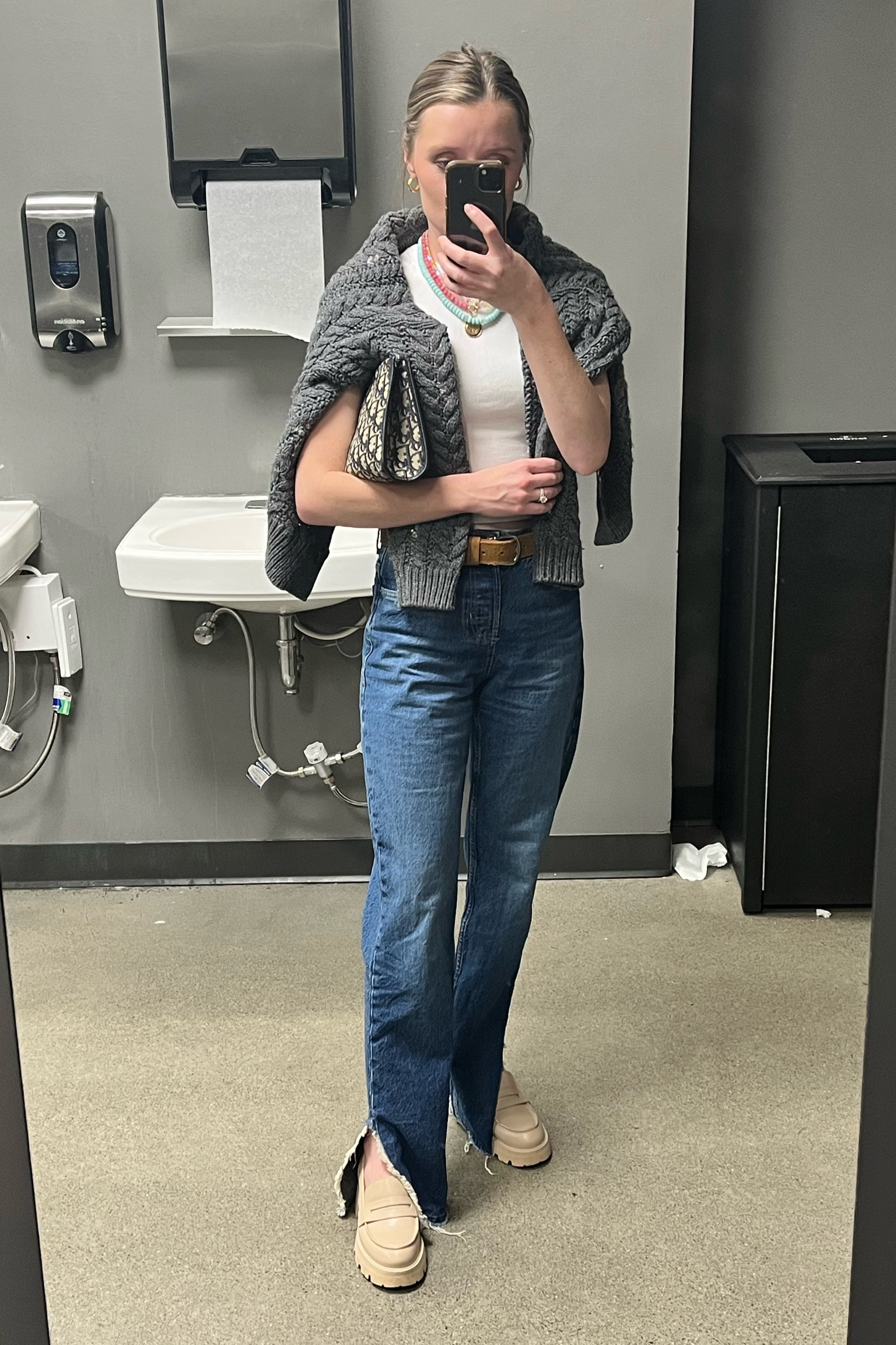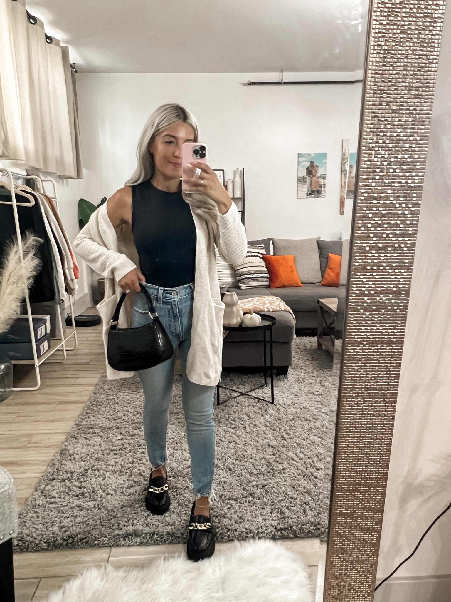 The ensemble masterfully balances comfort and style, leveraging the timeless appeal of a cozy cardigan and classic denim to create a look that’s effortlessly chic. Accents like the sleek black accessories and trendy fur-lined shoes add a modern, edgy twist to the outfit.