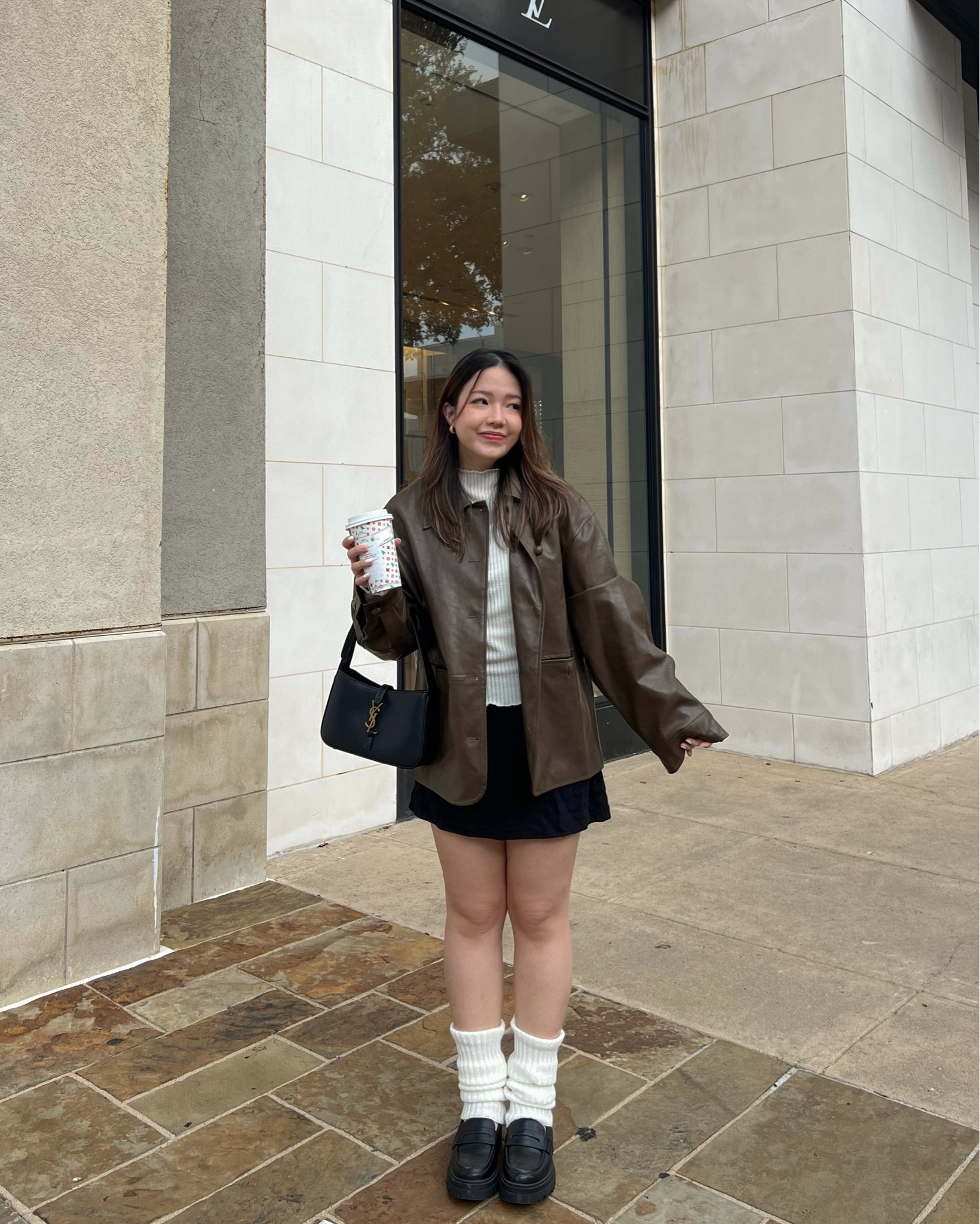 This ensemble exudes a chic, effortless vibe with its oversized blazer, perfectly juxtaposing the structured silhouette against the playful mini skirt. The chunky boots and high socks add a trendy, youthful edge, while the color palette remains sophisticated and earthy.