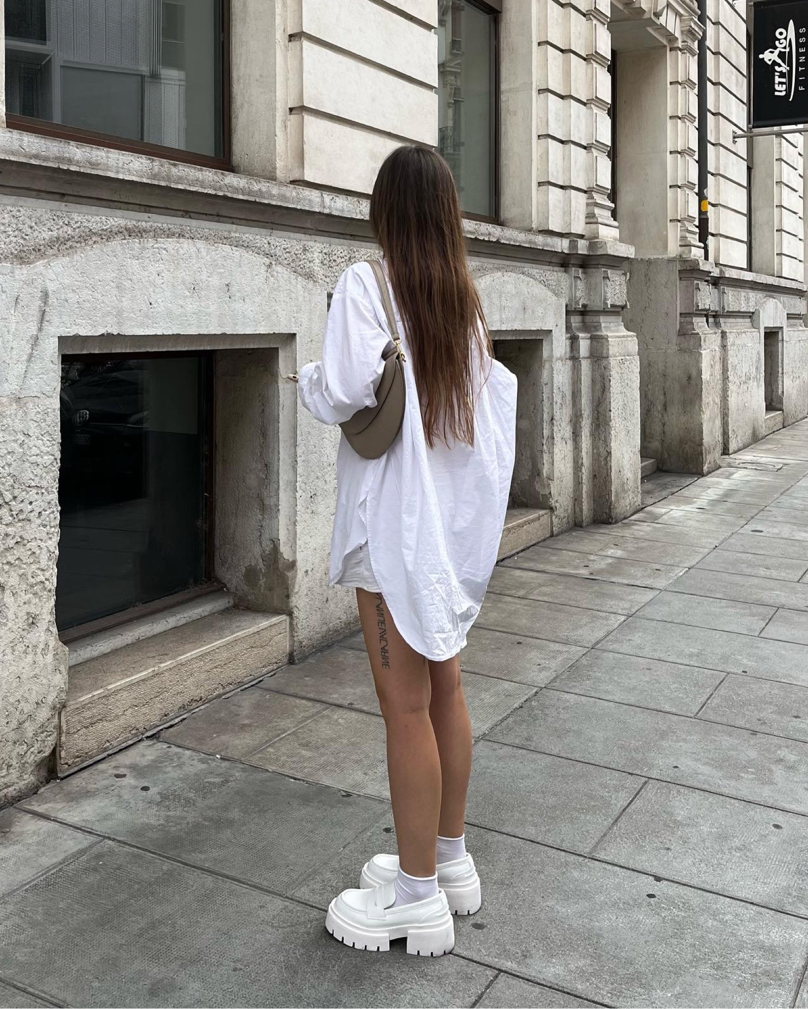 The oversized white shirt exudes a chic, effortless style—it’s both timeless and versatile, perfect for a variety of occasions. Paired with chunky white platform shoes, the outfit achieves a modern edge that’s on-trend and adds a striking contrast in proportions.