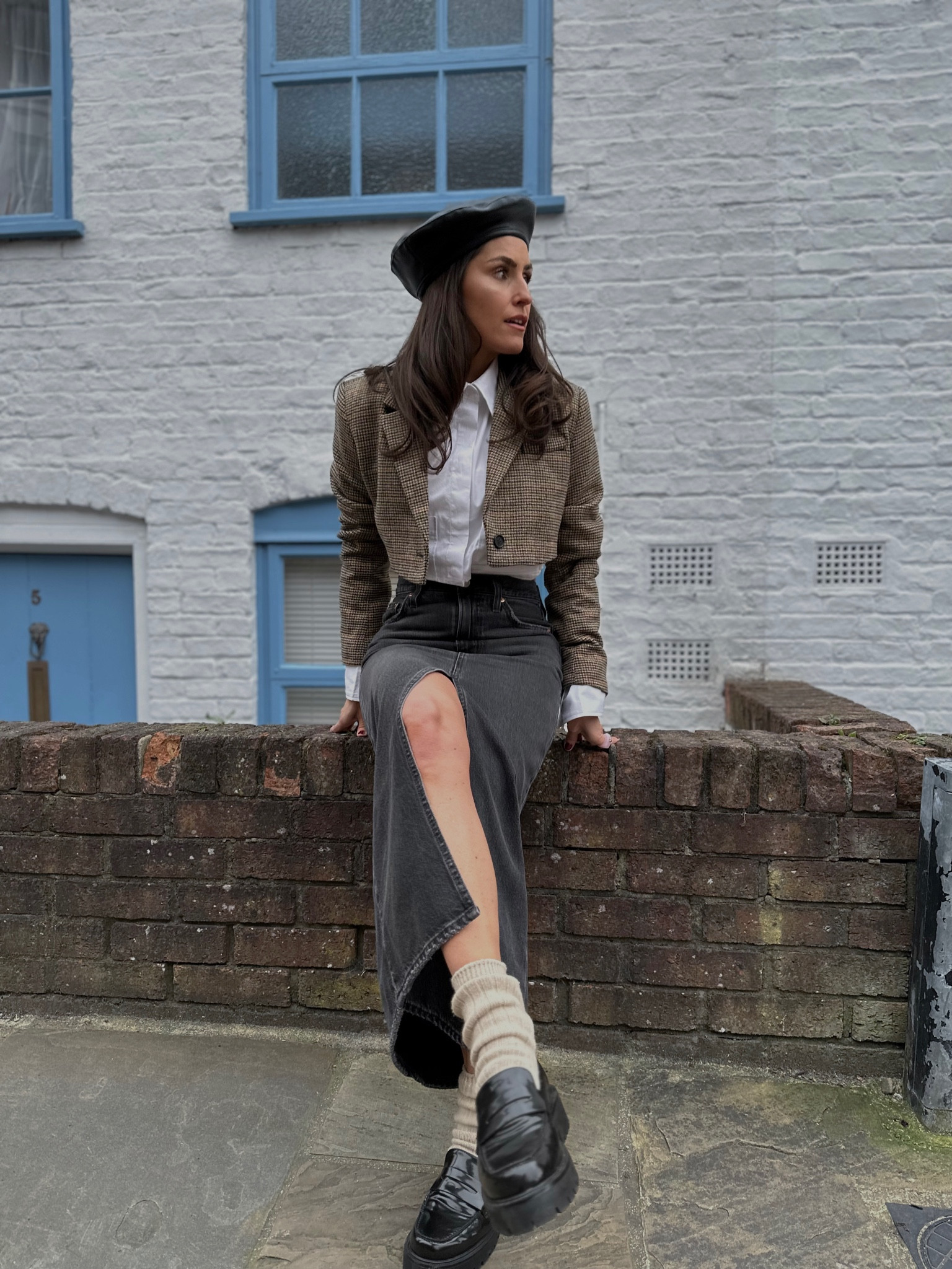 The ensemble exudes a timeless chic, blending classic elements like the tweed jacket and beret with a contemporary edge, courtesy of the ripped denim skirt and chunky boots. The layering and neutral palette harmonize perfectly, creating a cohesive, effortlessly stylish look.