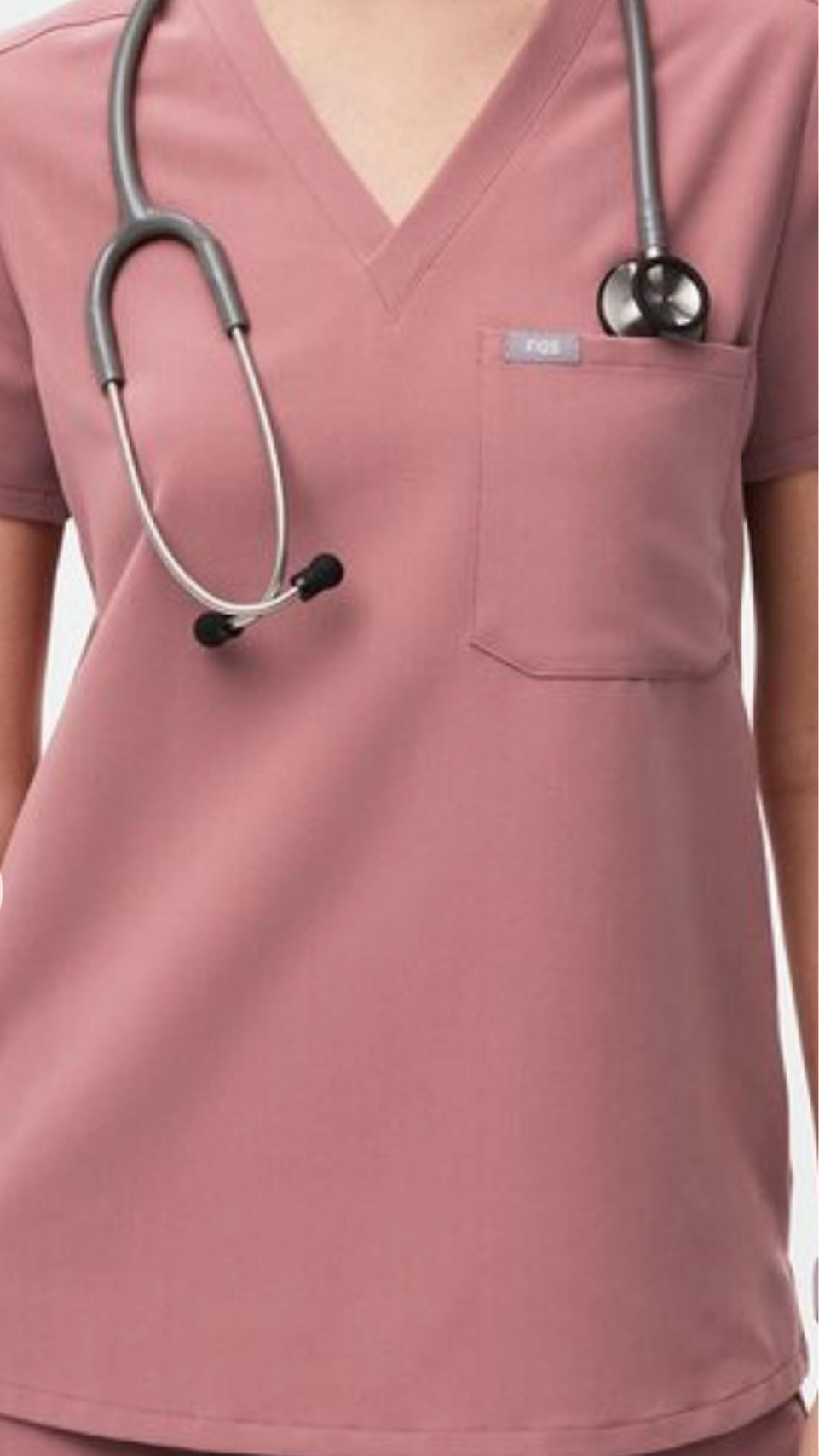 The soft rose hue of the scrubs offers a soothing and approachable look, ideal for medical settings, while the V-neck cut and tailored fit ensure practicality without sacrificing style. The pocket placement is perfect for essential tools, enhancing both functionality and efficiency.