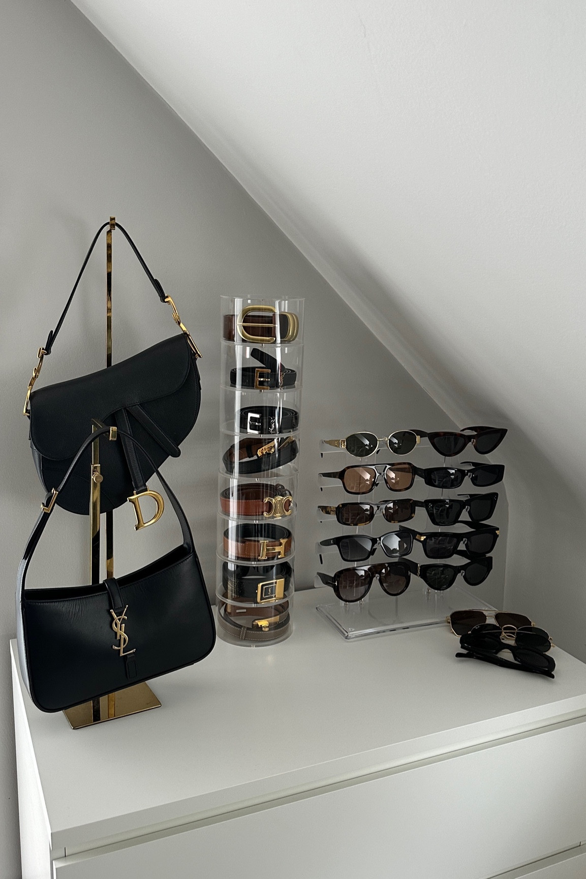 The sleek black handbag with gold hardware exudes sophistication and versatility, perfect for both day-to-night transitions. The well-organized display of sunglasses offers a range of styles, suggesting this outfit can be adapted to multiple occasions with just the right accessory swap.