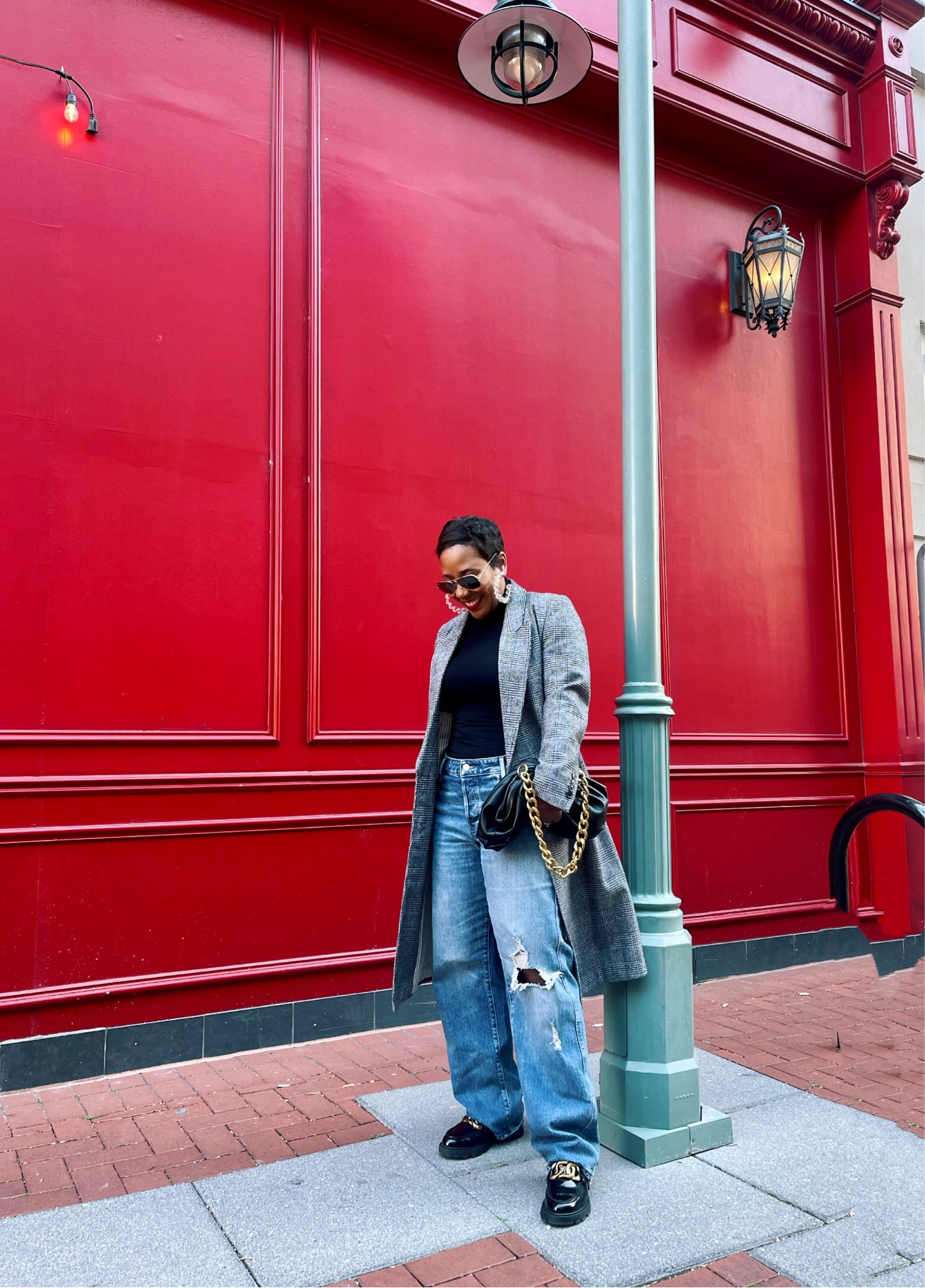 The outfit strikes an excellent balance between casual and chic, with the oversized blazer and wide-leg jeans creating a modern, effortlessly cool silhouette. The use of classic colors and the addition of statement accessories like the sunglasses and chain-strap bag add a polished finish to the look.