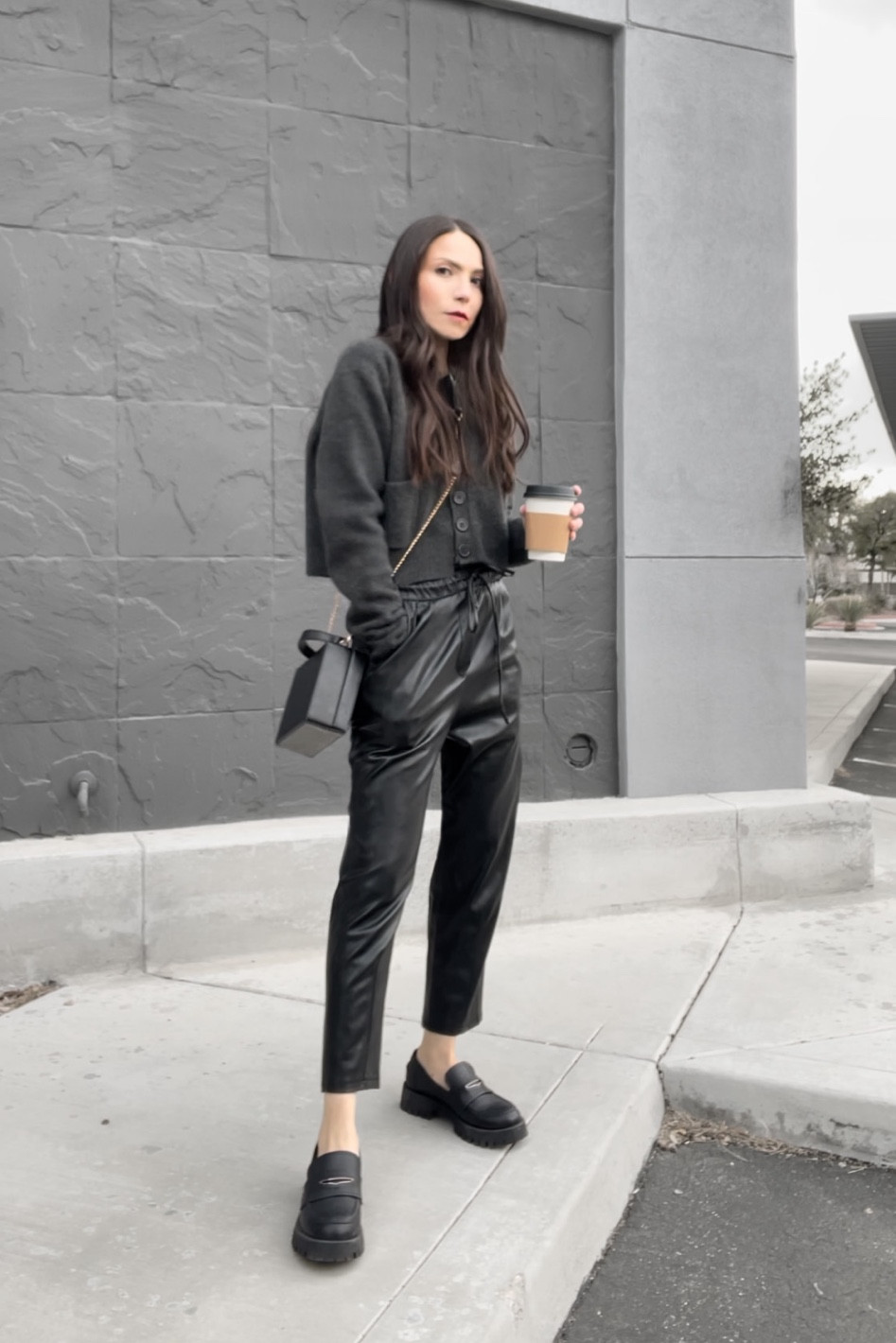 The ensemble masterfully blends comfort with edge; the oversized grey blazer paired with the sleek leather pants creates a chic, modern silhouette. Accessorized with minimalistic black loafers and a structured bag, the look achieves an effortlessly sophisticated yet casual vibe.