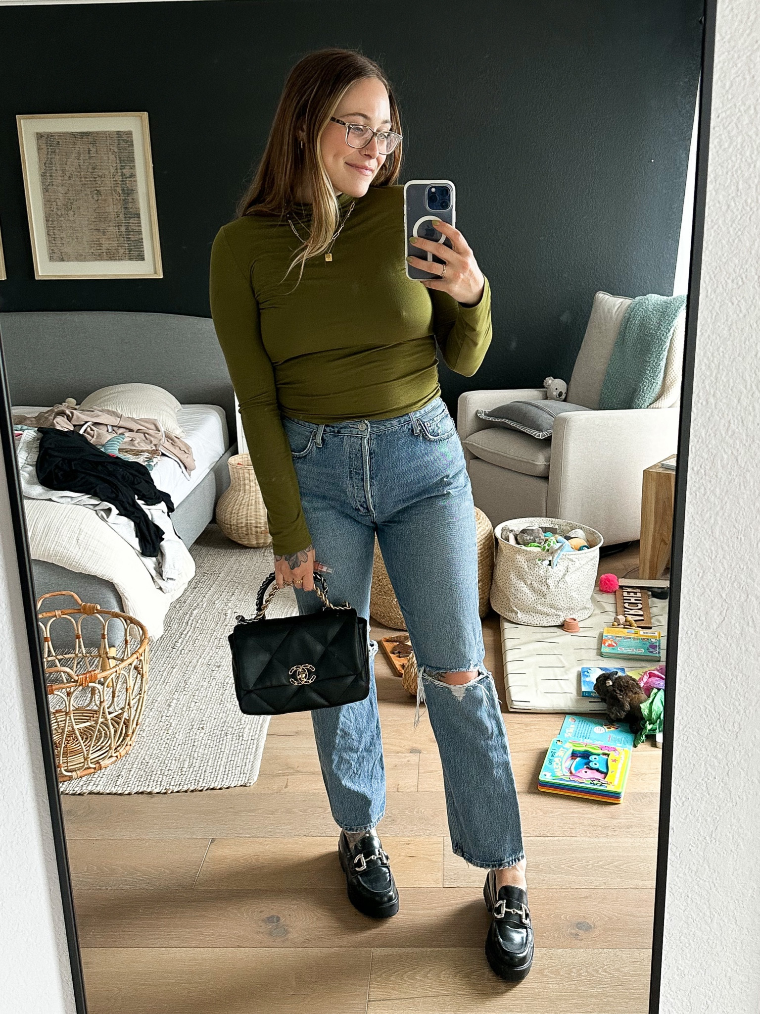 The olive green fitted top provides a flattering silhouette and harmonizes well with the high-waisted ripped jeans, giving off a chic yet casual vibe. Accessories like the classic black shoulder bag and chunky loafers add a touch of sophistication to the ensemble.