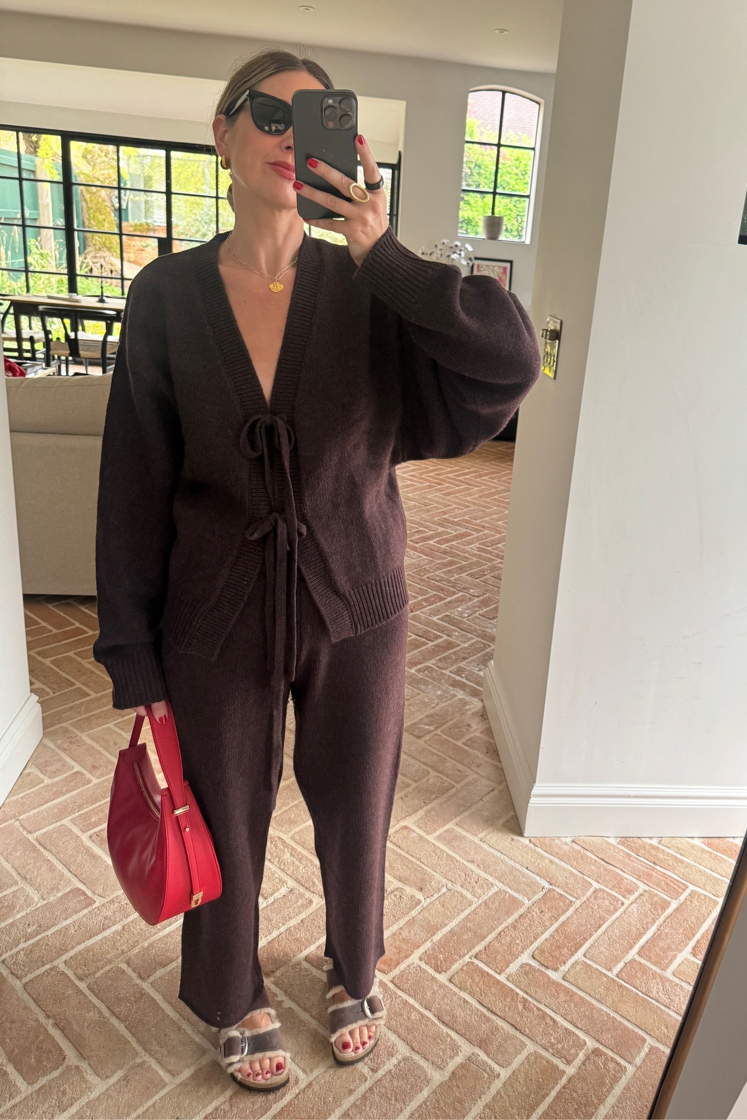 The ensemble exudes casual elegance with its clean lines and comfortable fit, creating a relaxed yet put-together appearance. The rich, deep color adds a touch of sophistication, while the choice of accessories provides a nice pop of contrast.