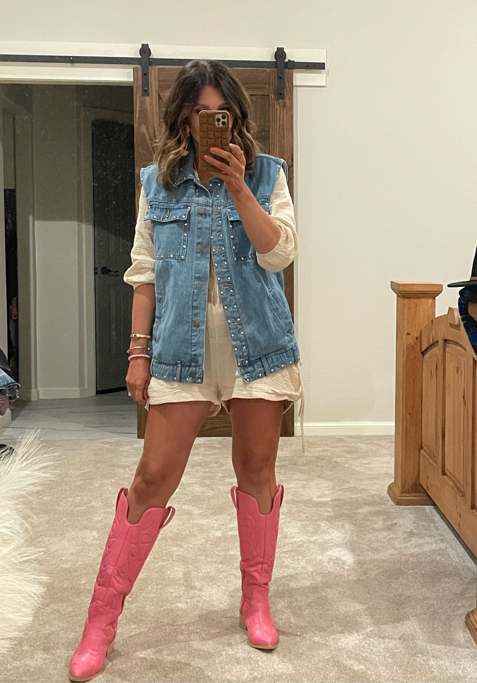 The ensemble artfully combines casual and edgy elements, with the classic denim vest offering a timeless Americana feel that’s nicely contrasted by the bold statement of the pink boots. The neutral tones of the outfit underline its versatility, while the boots add a playful pop of color that’s sure to turn heads.