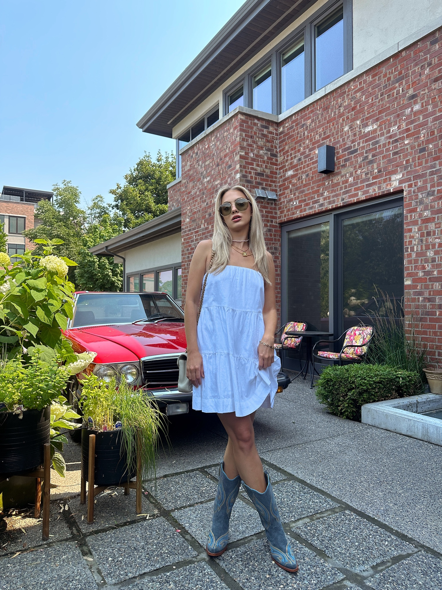 The airy white sundress offers a refreshing and effortlessly chic summer vibe, while the unexpected choice of blue cowboy boots adds a playful and edgy twist to an otherwise simple ensemble. The accessories are minimalistic, ensuring the boots and dress remain the focal points of the look.