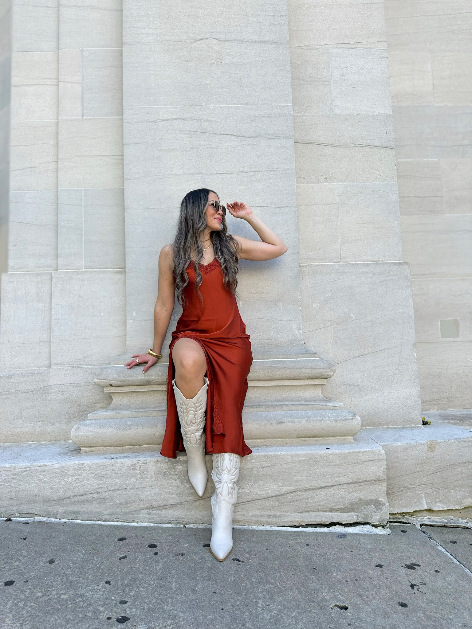The rich, earthy hue of the dress exudes a warm elegance, and the high slit adds a touch of daring sophistication. The contrasting white boots offer a modern twist to the outfit, giving it an edgy yet chic finish.