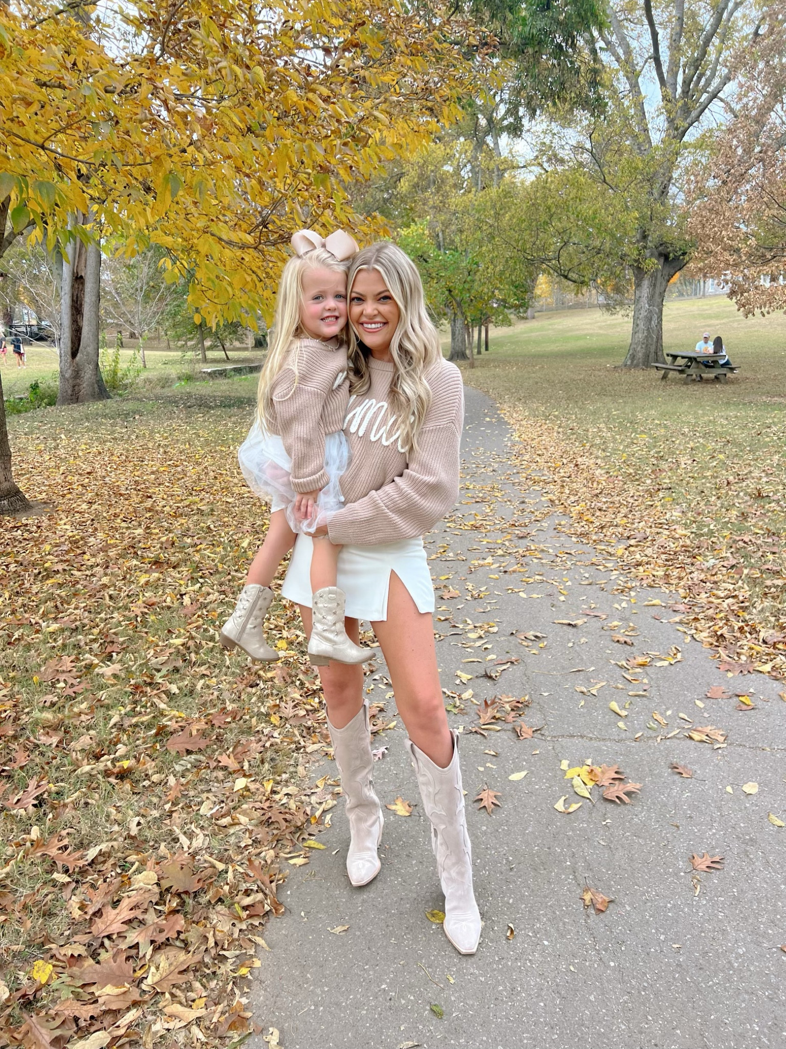 The oversized sweater paired with the high-waisted shorts offers a cozy yet chic vibe, perfect for a casual autumn day. The knee-high boots elevate the look, adding a touch of elegance and warmth suitable for the season’s cooler temperatures.
