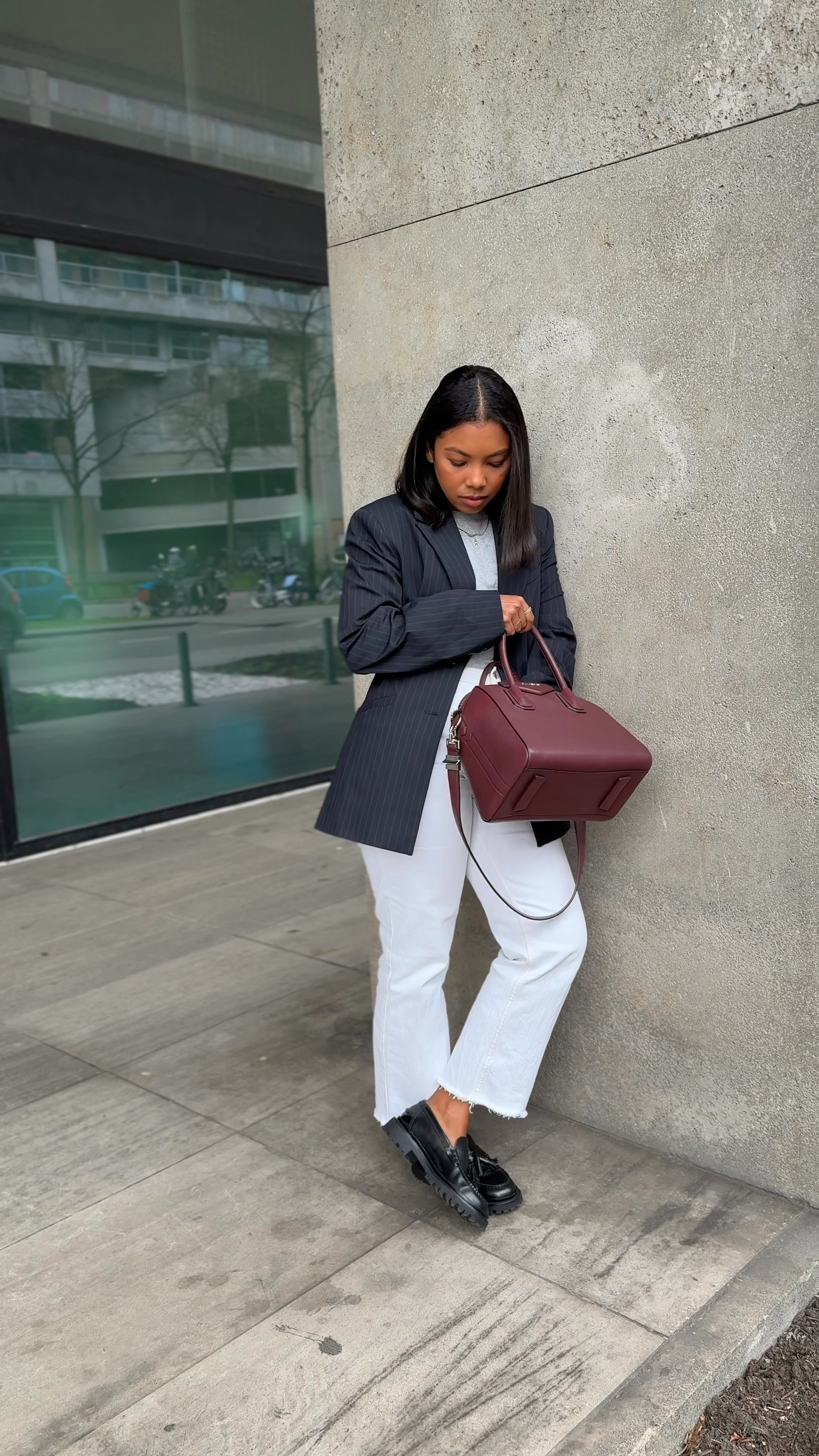 The classic black blazer with white trousers offers a timeless and professional look, while the bold burgundy handbag adds a perfect pop of color that complements the outfit’s monochromatic palette.