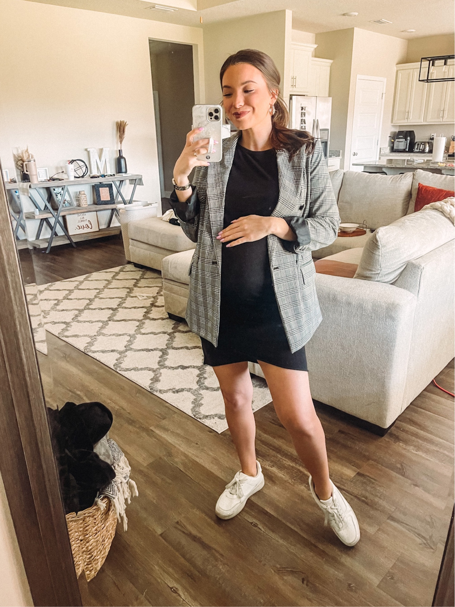 The blending of the classic checkered blazer with a simple black dress creates a smart-casual aesthetic that’s both polished and accessible. The addition of white sneakers adds a youthful and relaxed twist to the ensemble, striking a perfect balance between comfort and style.