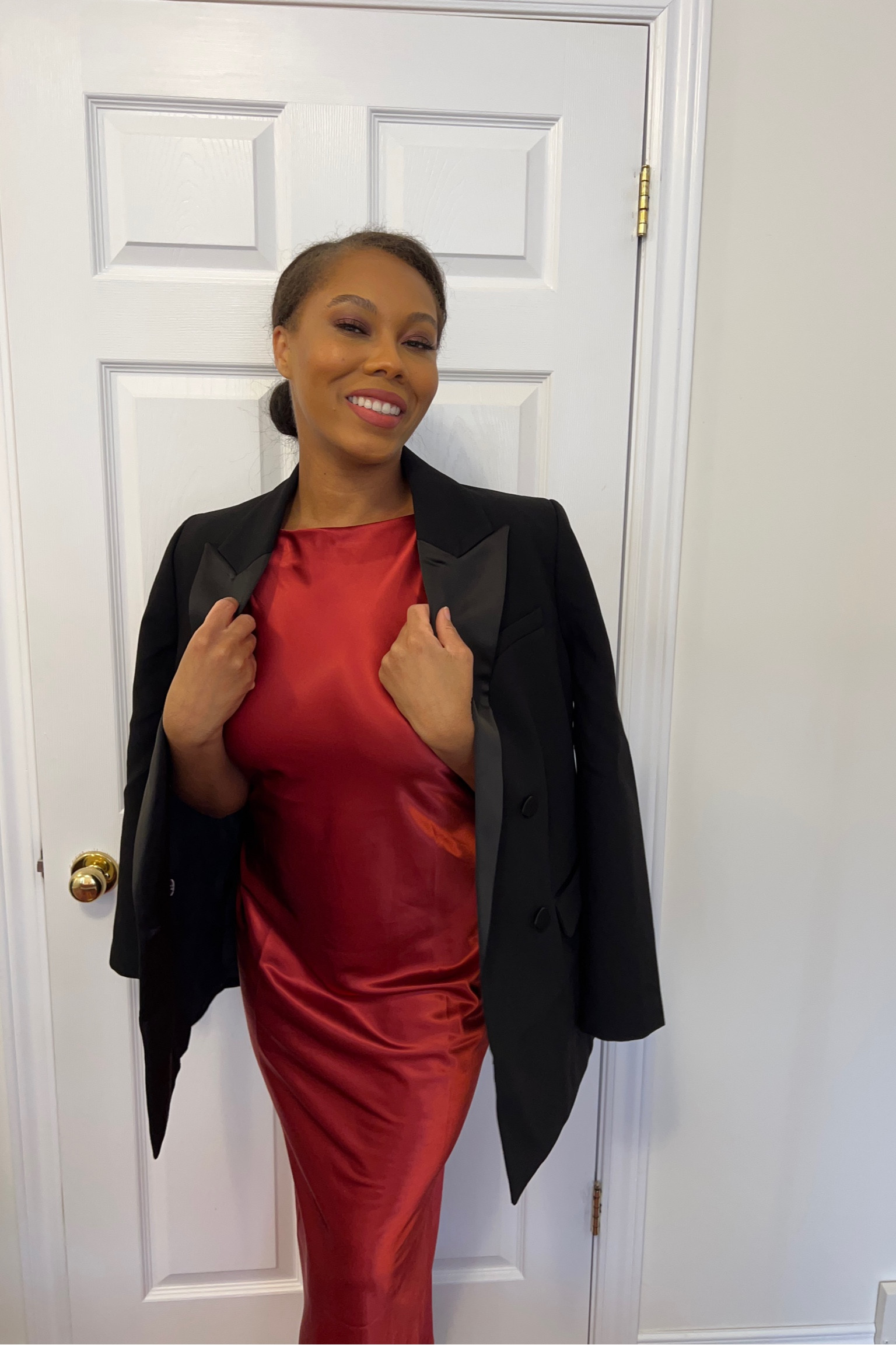 The rich, red satin dress paired with the classic black blazer creates a striking contrast that’s both sophisticated and eye-catching. The ensemble exudes confidence with its tailored fit and the simplicity of the solid colors enhances the wearer’s elegance.