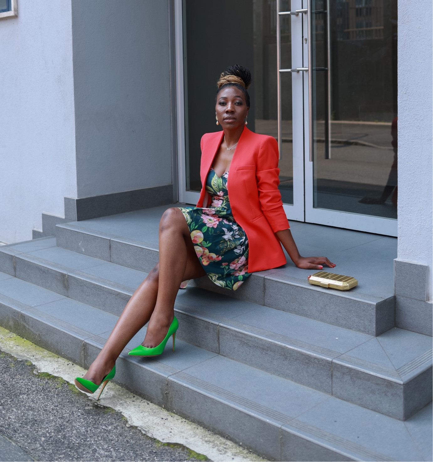 The vibrant orange blazer brings a pop of color that contrasts beautifully with the floral dress, creating a bold and lively ensemble. The eye-catching green heels add a playful and unexpected twist that perfectly complements the outfit’s cheerful palette.