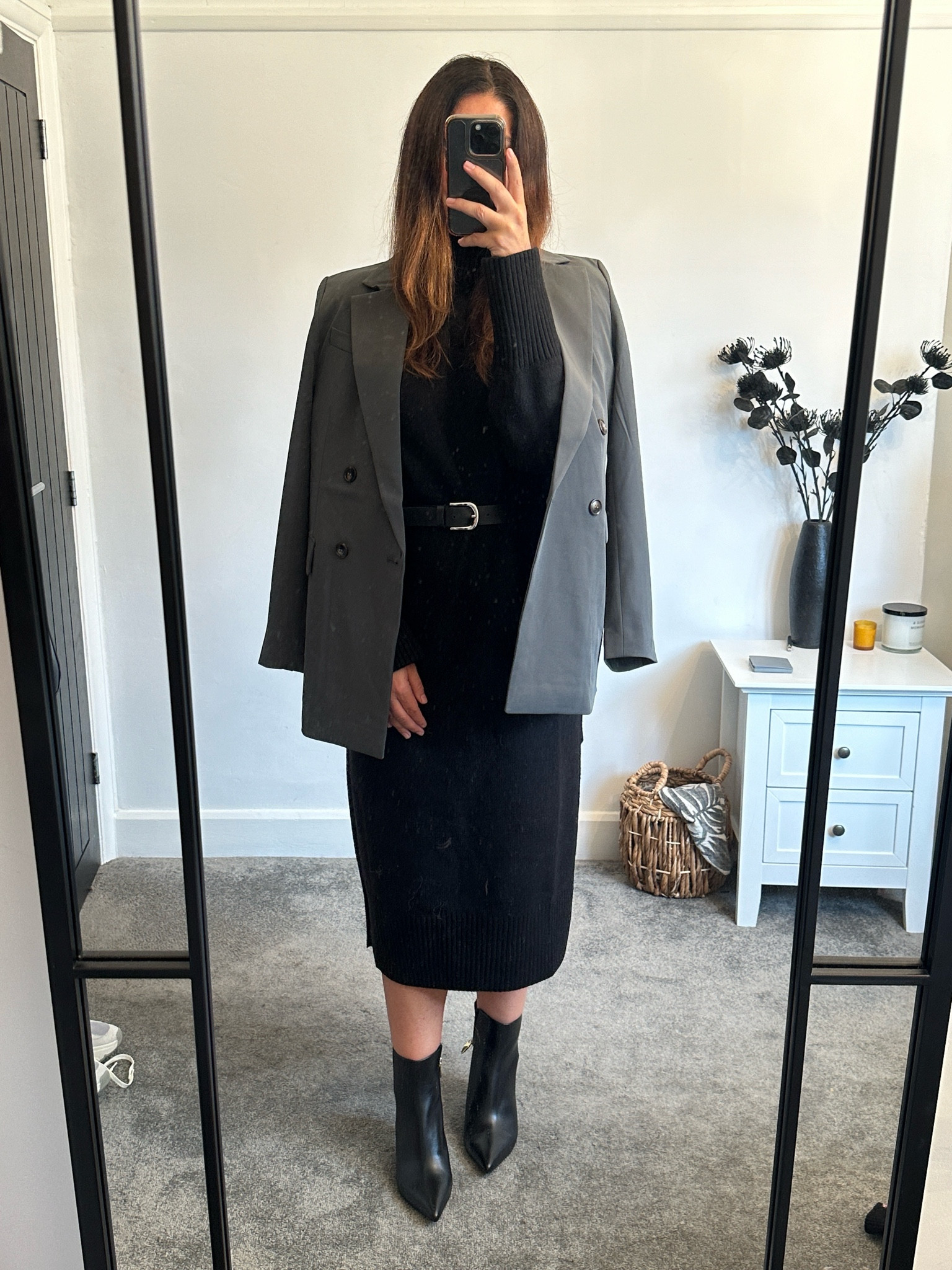 The monochromatic color scheme of this ensemble exudes sophistication and creates a seamless, elongated silhouette. The classic tailored blazer adds structure to the comfortable knit dress, while the ankle boots provide a modern edge and tie the look together effortlessly.