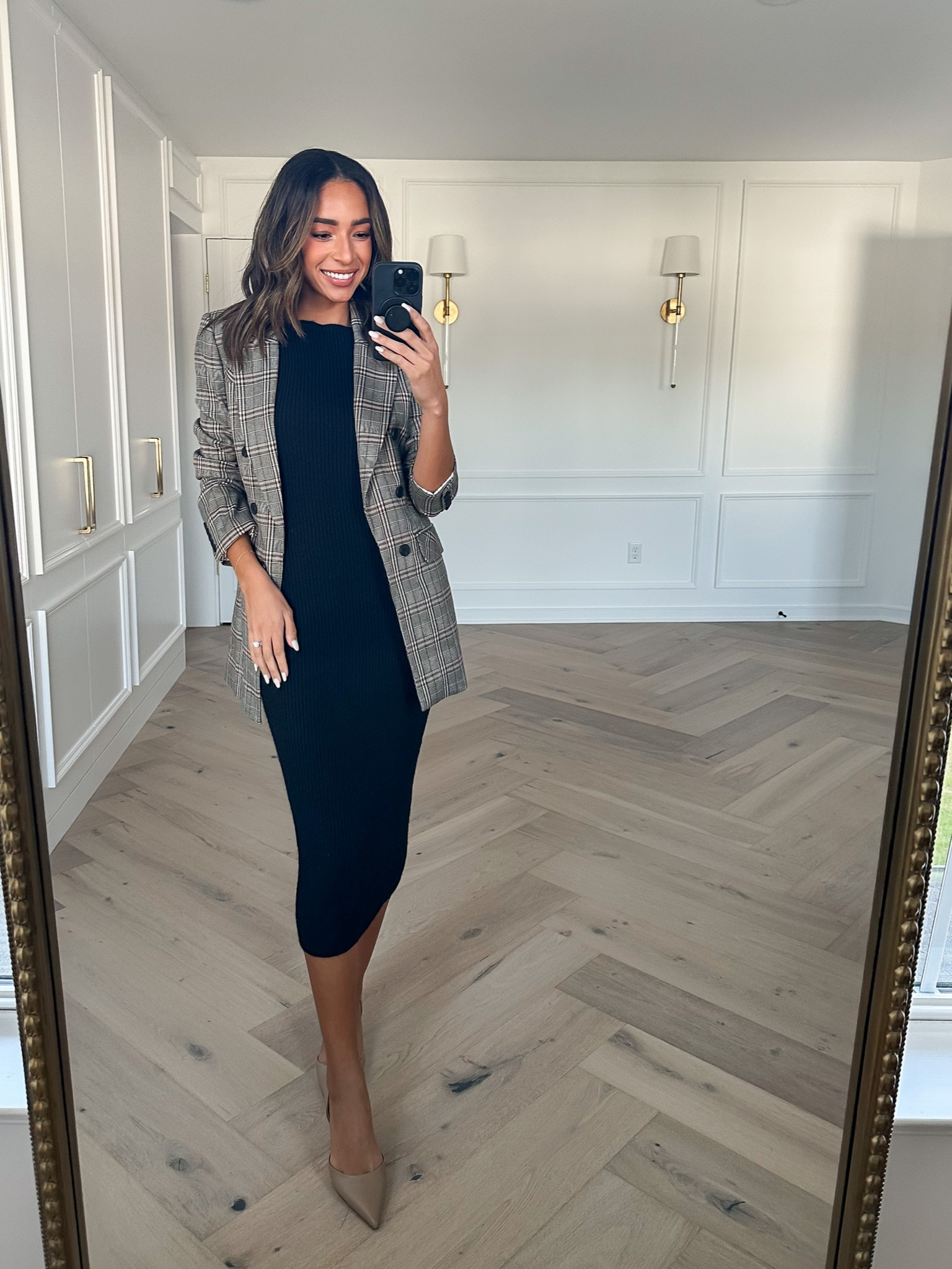 The ensemble exudes a chic and timeless appeal, where the classic checkered blazer perfectly complements the sleek black dress underneath, creating a balanced contrast. The addition of the pointed beige heels elongates the silhouette, crafting an elegant and professional look.