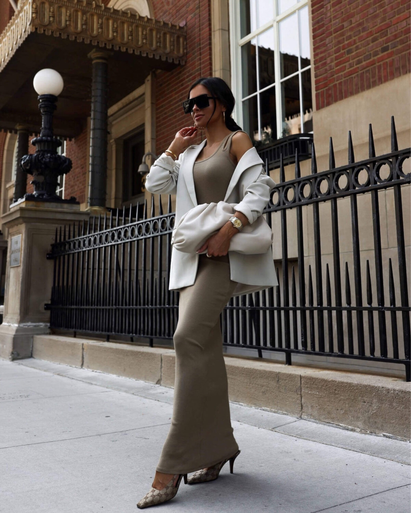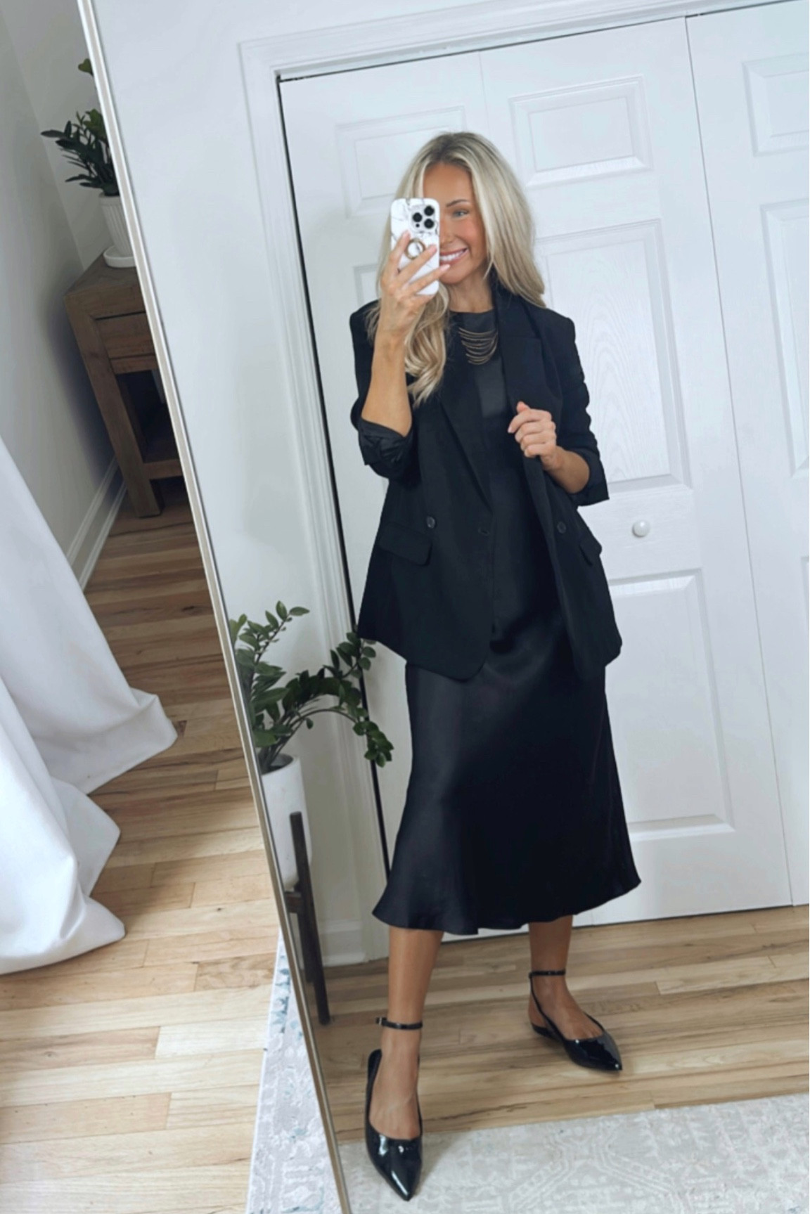 The monochromatic color palette exudes elegance and creates a seamless, elongating silhouette, while the blending of the structured blazer with the fluidity of the slip dress strikes a perfect balance between sophistication and femininity. The pointed-toe heels add a sharp, classic finish that elevates the entire ensemble.