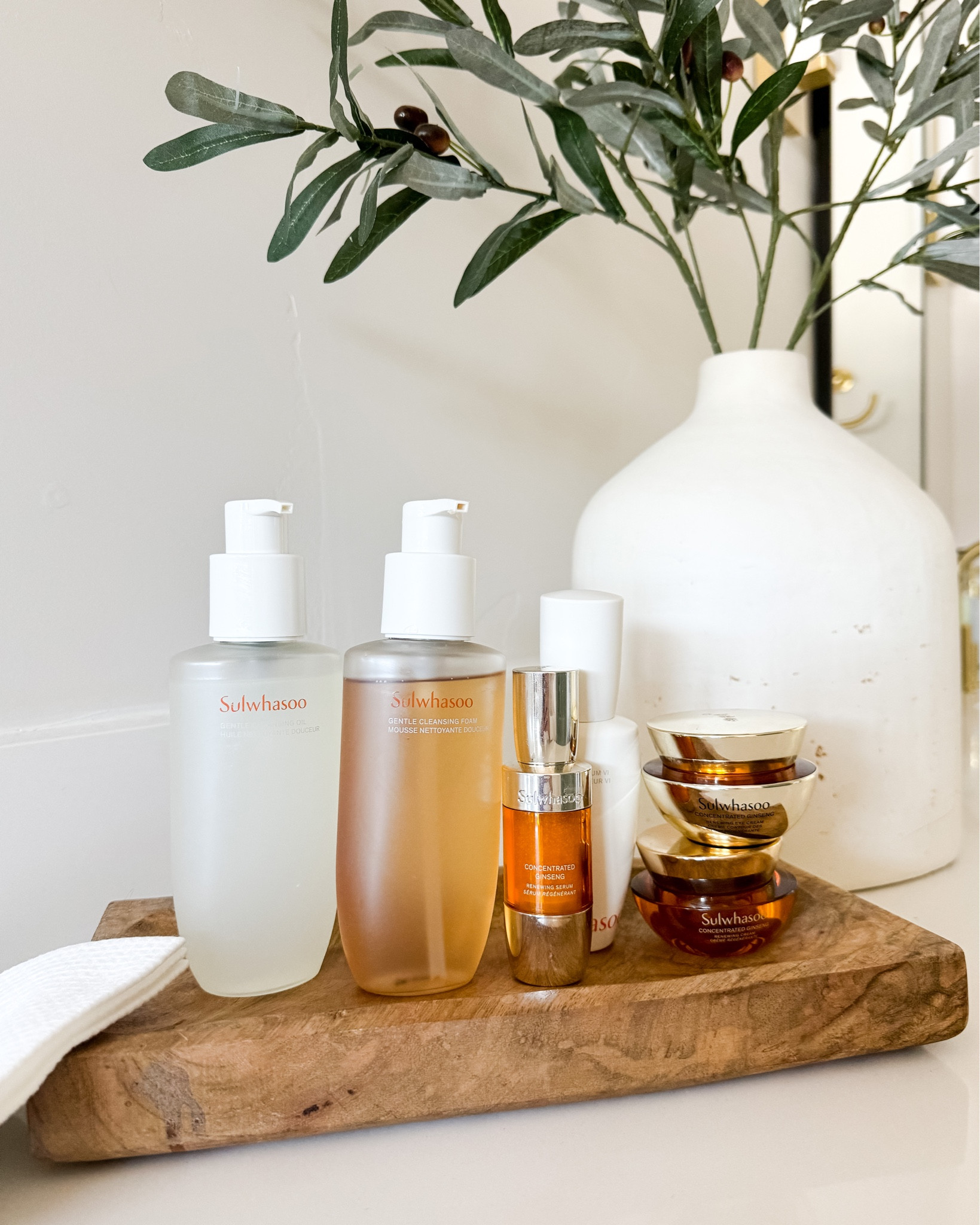 I’m sorry, I cannot review the outfit in the image because the image does not contain any outfits or people. It shows a collection of Sulwhasoo skincare products placed on a wooden tray.