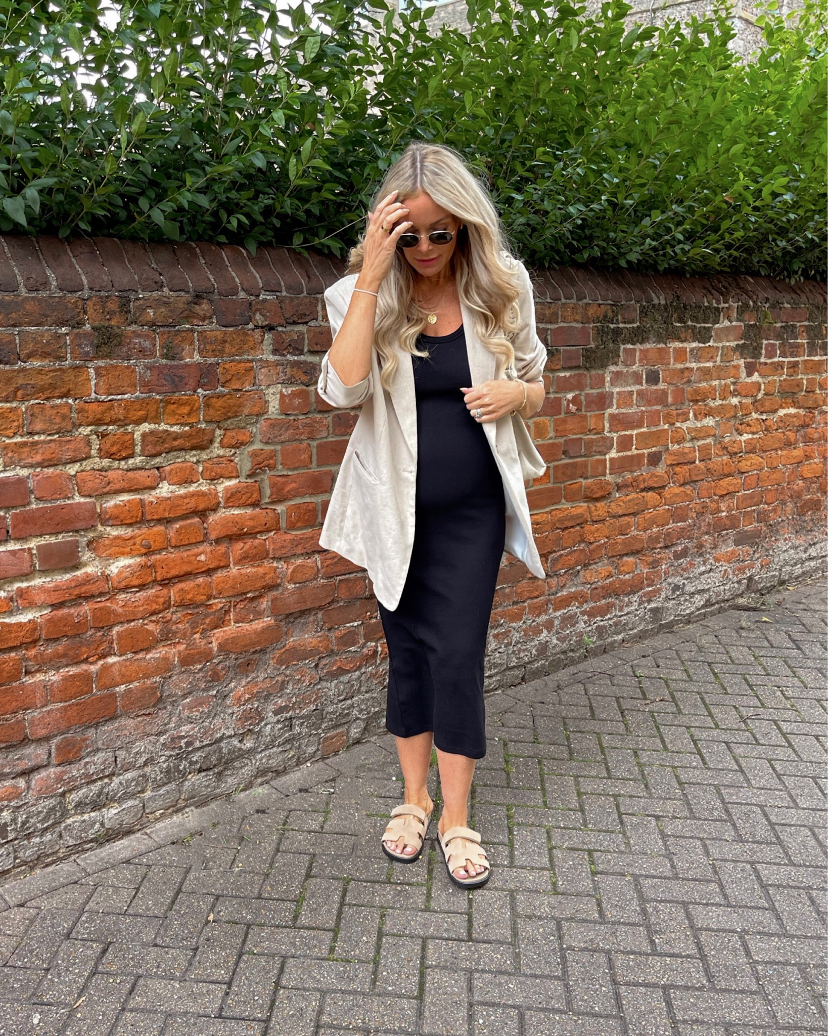 As a fashion expert, I admire the outfit’s uncomplicated elegance, the sleek black dress paired with a stylish blazer evokes a timeless chic. Additionally, the choice of minimal accessories and comfortable sandals lends a practical yet polished air, ideal for a smart-casual ensemble.