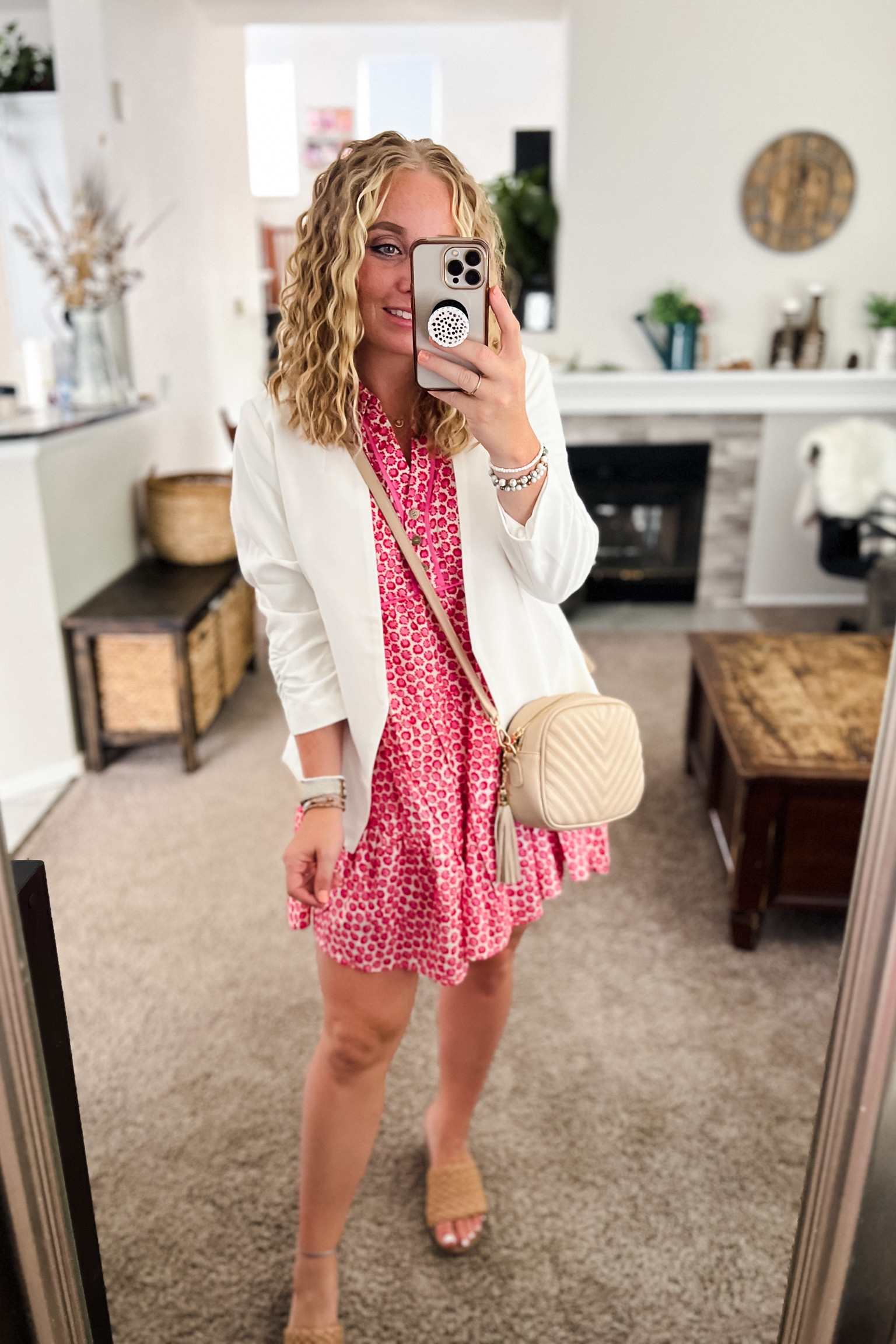 The vibrant pattern of the dress provides a cheerful and eye-catching pop of color, which is elegantly balanced by the crisp white blazer, creating a polished and playful ensemble. The neutral accessories, including the subtle nude heels and the classic quilted bag, complement the outfit perfectly without overpowering it.
