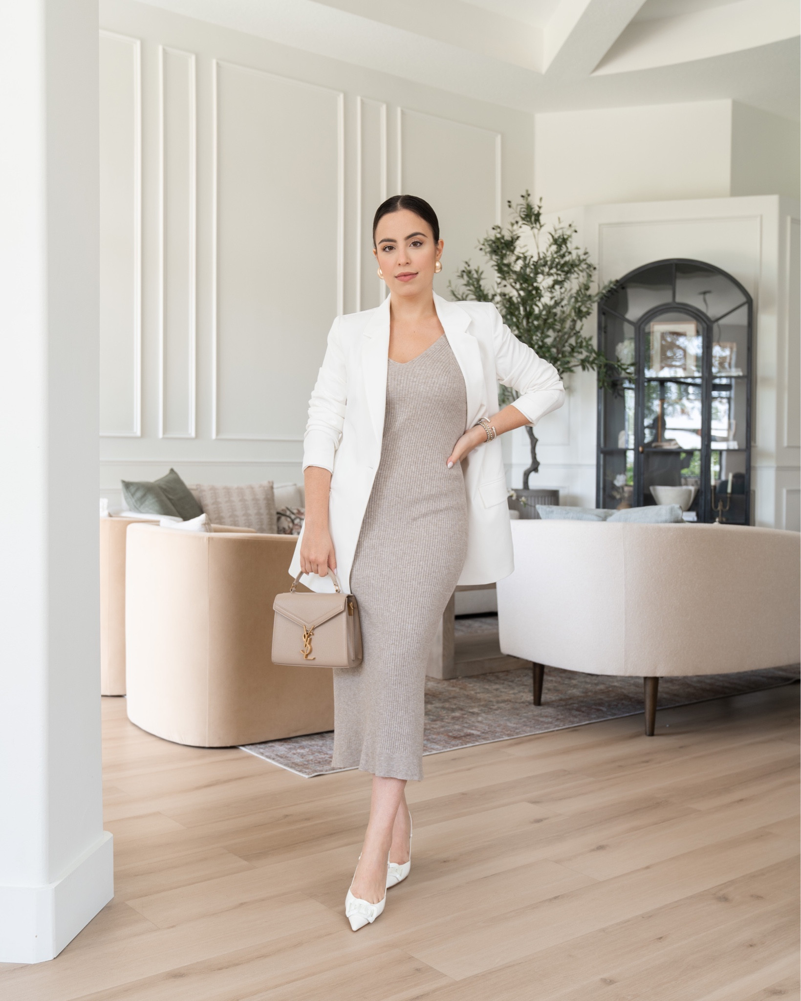 The outfit exudes chic professionalism with its structured blazer adding a sharp, tailored edge to the feminine, flowing lines of the white dress beneath. Neutral tones are perfectly paired, ensuring versatility and elegance, accented by pointed-toe heels that elongate the silhouette.