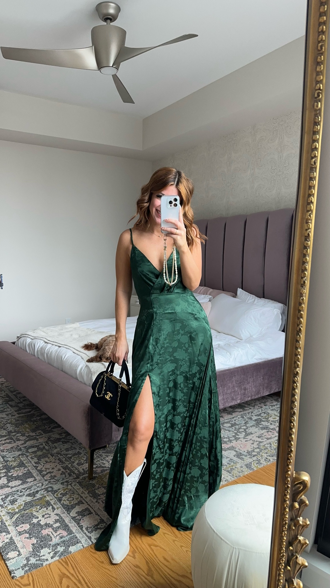 The deep emerald green of the dress exudes a sense of luxury and elegance, accentuating the wearer’s silhouette beautifully, while the high slit adds a tasteful allure. The pairing with contrasting white boots is a bold and fashionable choice that adds an edgy twist to the overall ensemble.