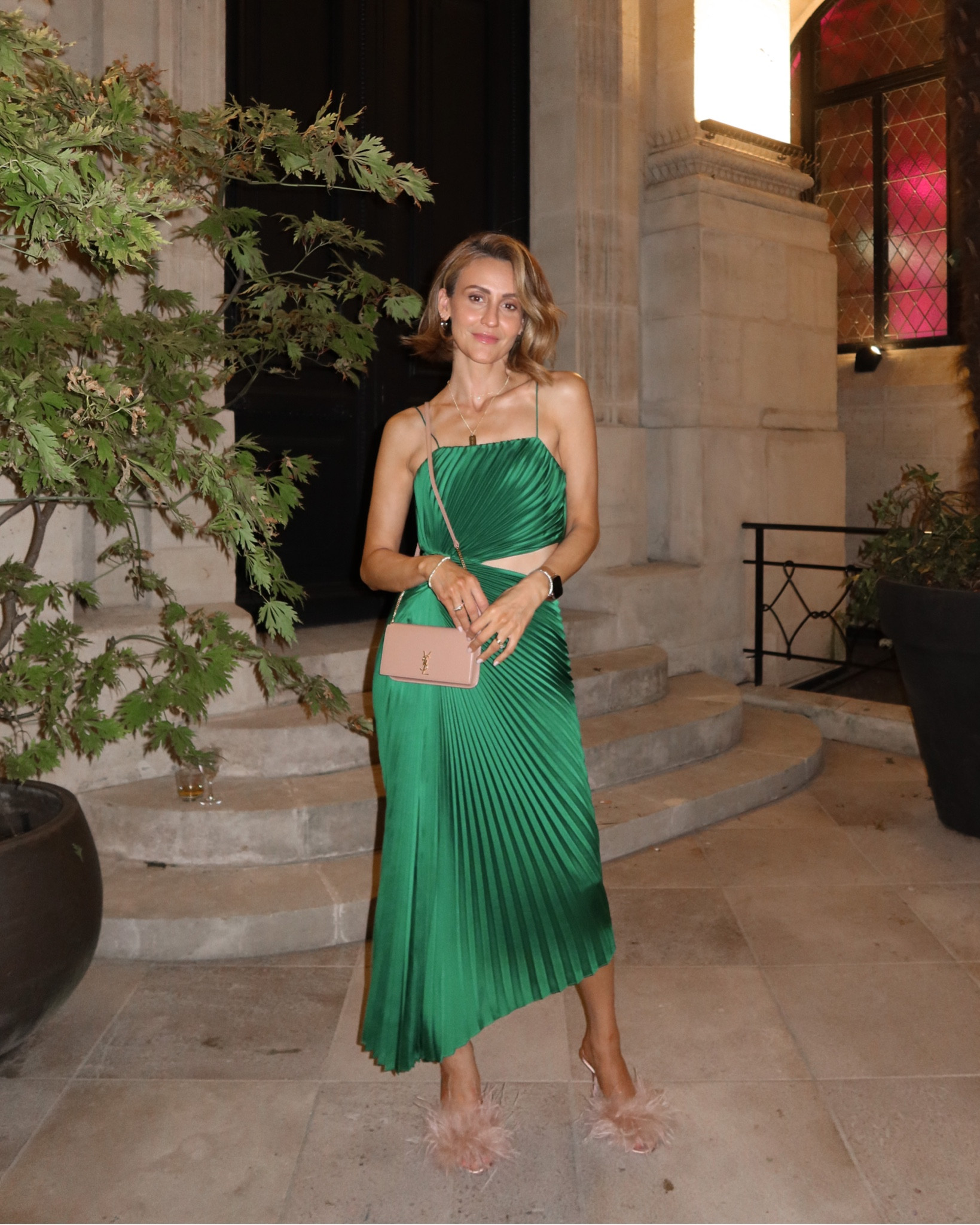 The rich emerald hue of this pleated dress is absolutely stunning and perfectly complements her skin tone. The elegant simplicity of the silhouette combined with the subtle texture adds a touch of classic sophistication with a modern twist.