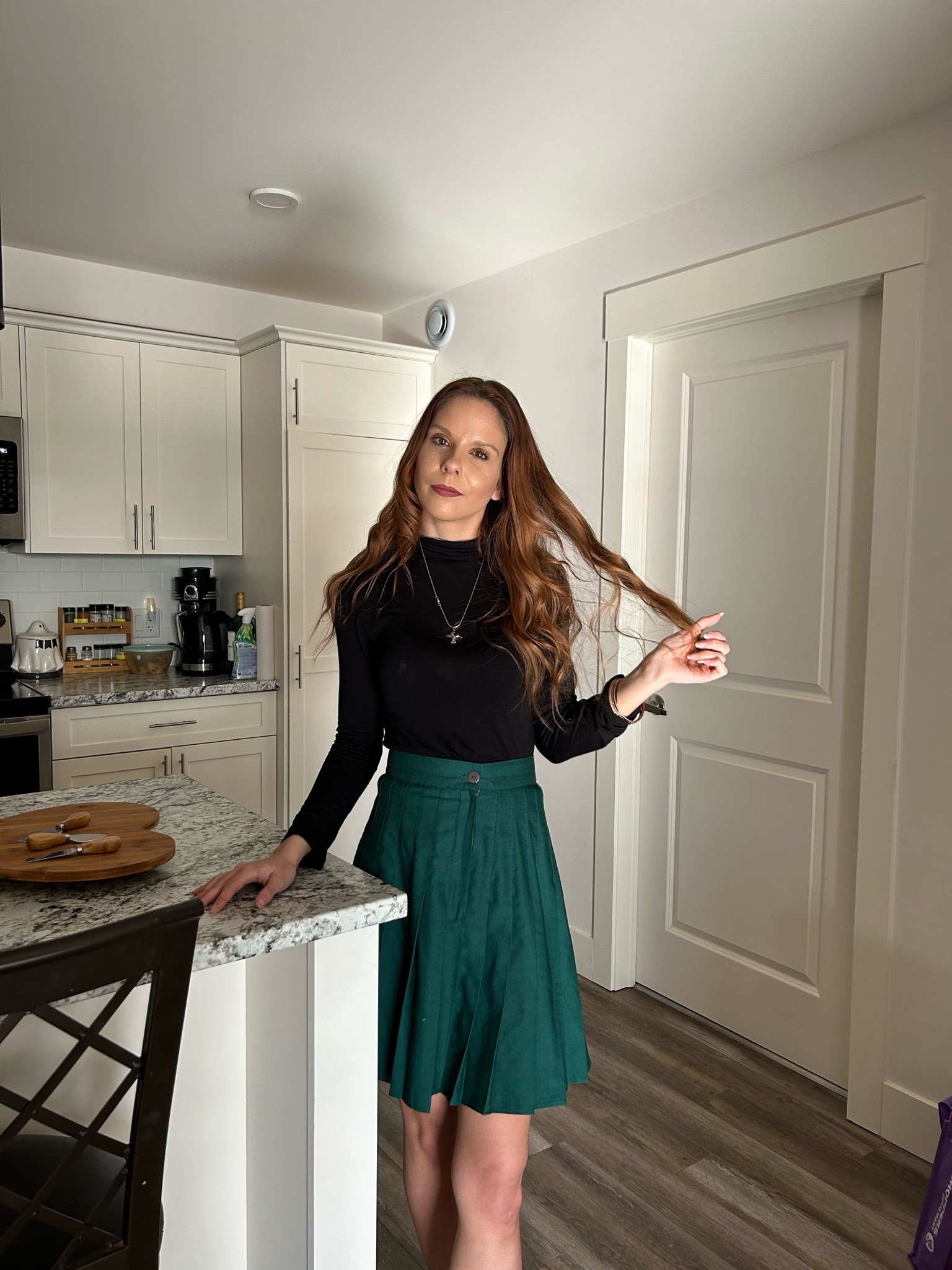 The outfit pairs a chic black top with a flattering, vibrant green skirt, creating a balanced look that’s both stylish and timeless. Accessorizing with a simple necklace adds a touch of elegance without overpowering the ensemble’s casual sophistication.