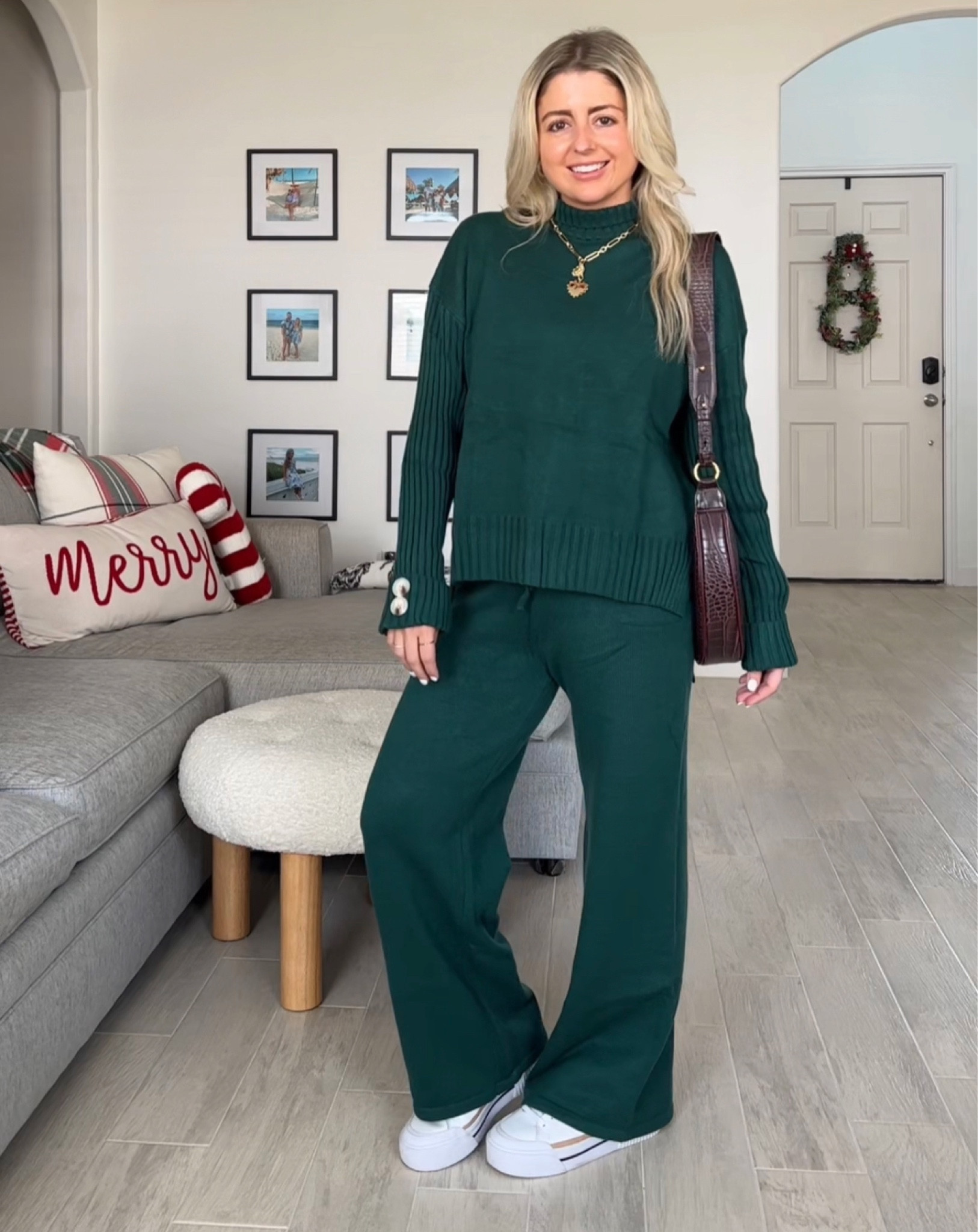 The monochromatic green ensemble creates an elegant and streamlined look, while the relaxed fit of the sweater and wide-leg pants offers a modern twist on comfort and style. The choice of simple white sneakers adds a casual, yet trendy flair, completing the outfit with a touch of effortless chic.