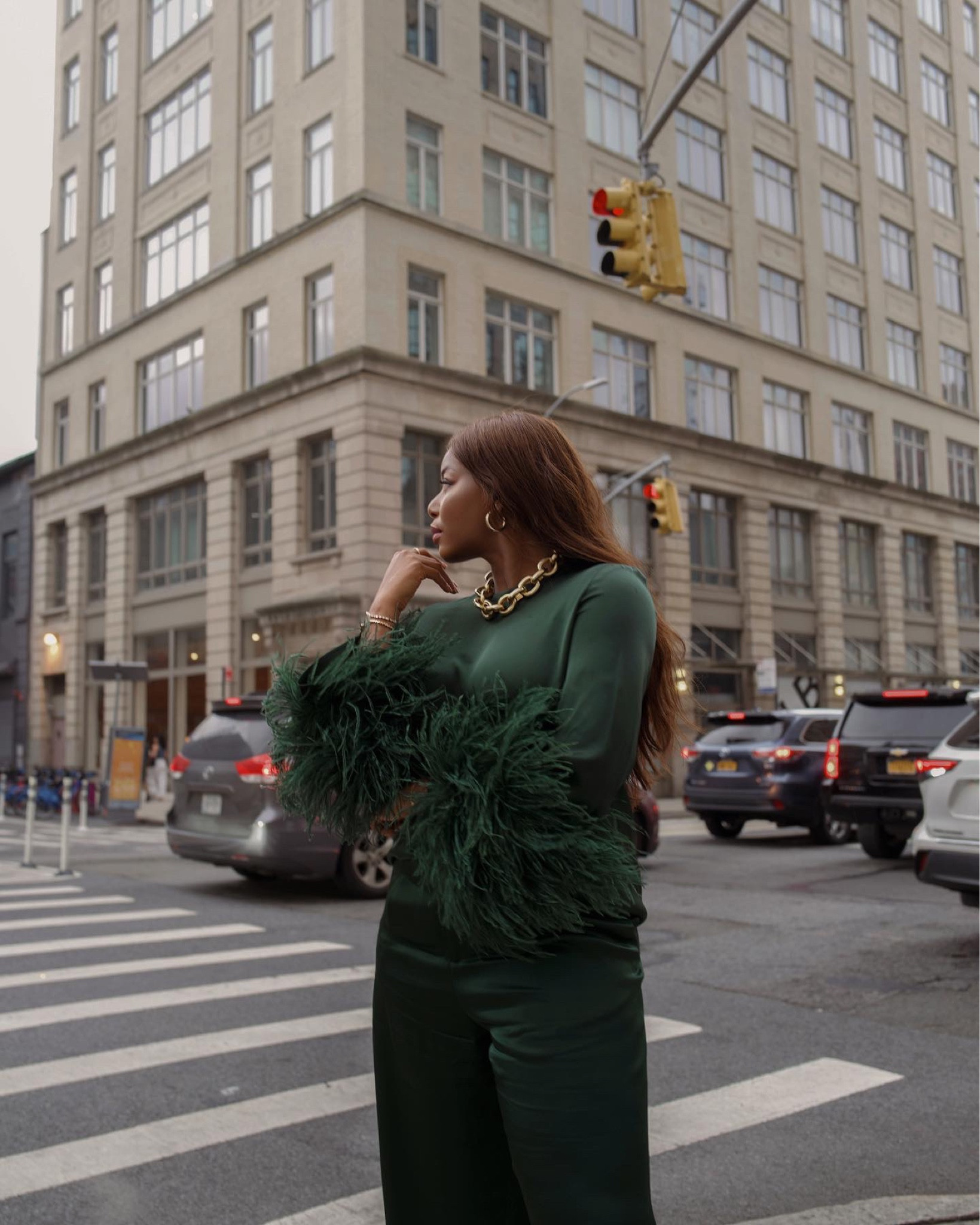 The outfit stands out with its unique feather detailing on the sleeves, adding a touch of luxury and texture that elevates the piece with a dramatic flair. The monochromatic green palette is both bold and sophisticated, creating an effortlessly chic look that harmonizes beautifully with the urban background.