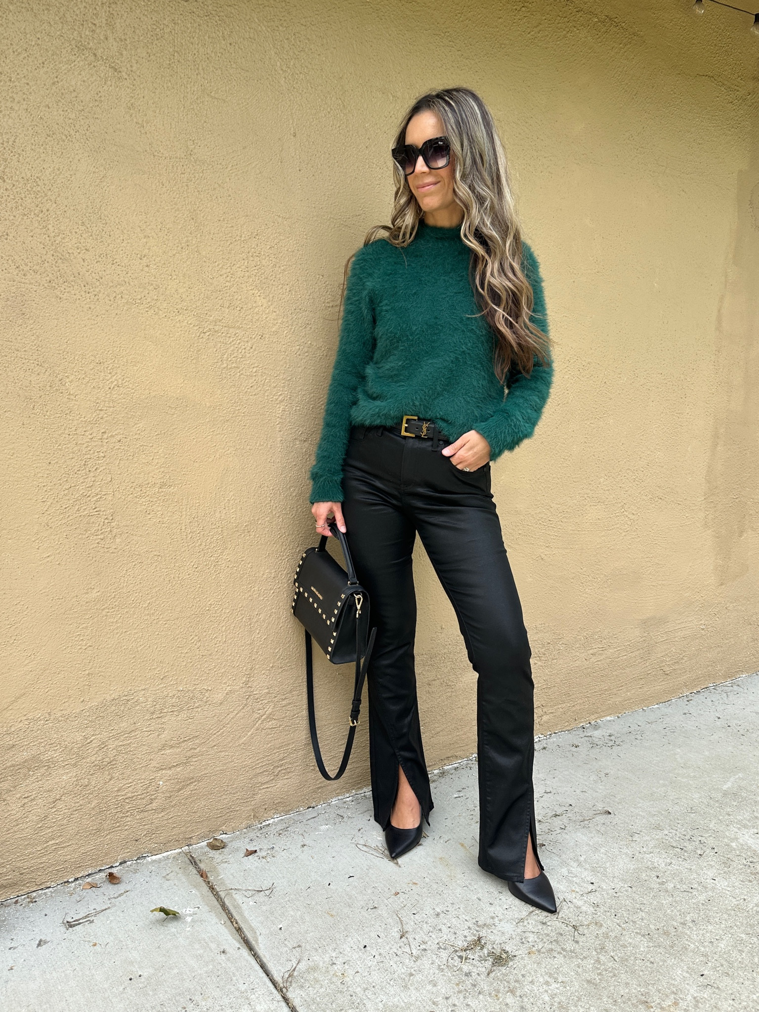 The rich emerald green of the sweater adds a pop of color and exudes a luxurious vibe, while the high-waisted black pants and pointed heels create a sleek, elongated silhouette that’s both classic and chic. The coordinated accessories, like the belt and the handbag, pull the ensemble together with a polished finish.