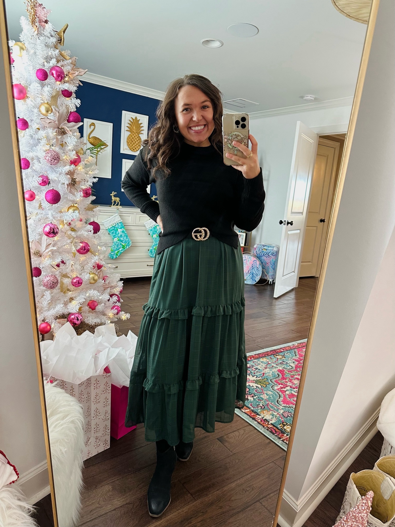 The outfit expertly balances elegance and comfort, with the tiered green skirt providing a playful yet sophisticated flow that complements the structured warmth of the black sweater. The addition of the bold belt cinches the waist, creating a flattering silhouette that ties the ensemble together beautifully.