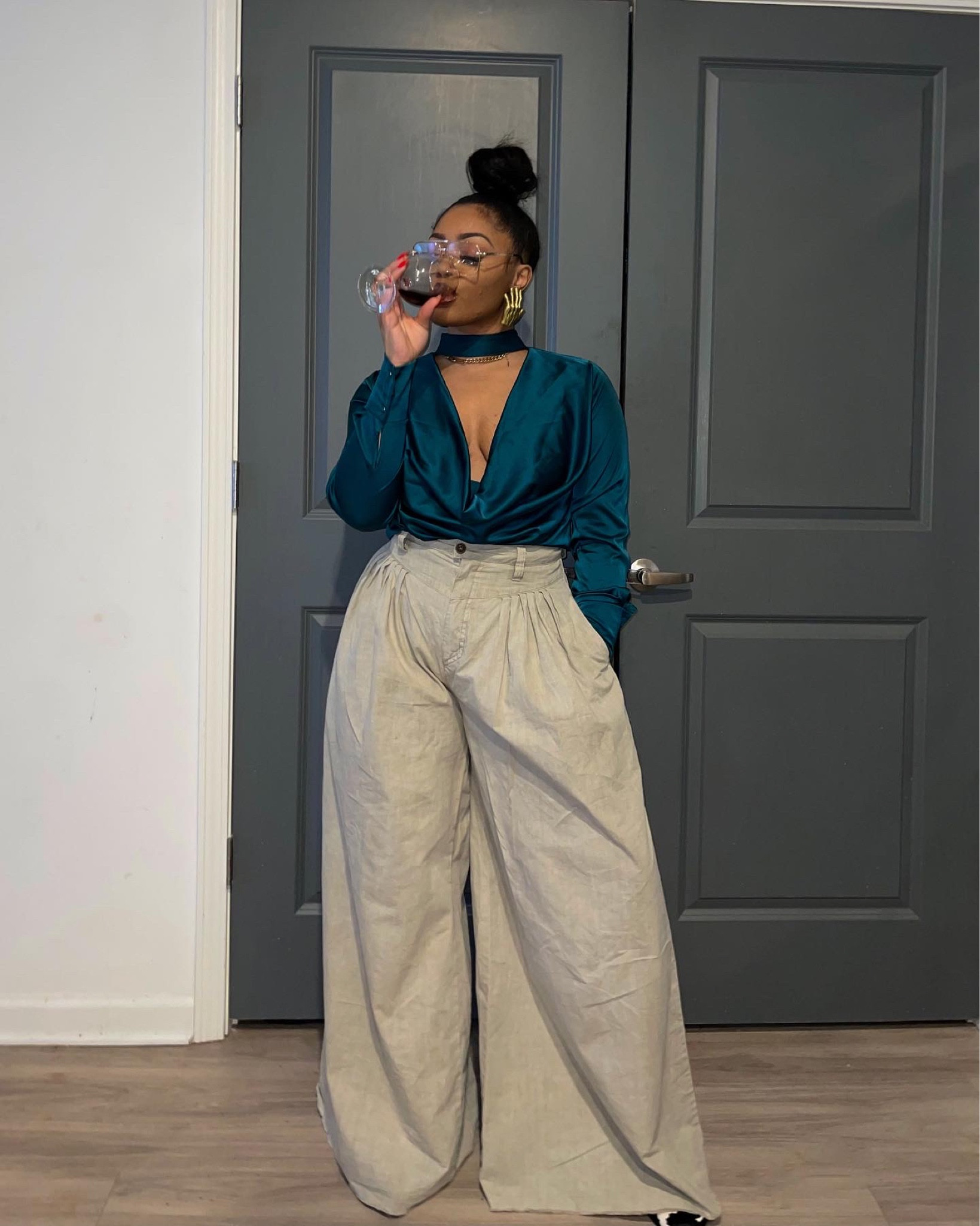 The bold blue top contrasts strikingly with the neutral wide-leg trousers, creating a sophisticated color palette, while the cinched waist and voluminous pants silhouette exude a modern and stylish flair.