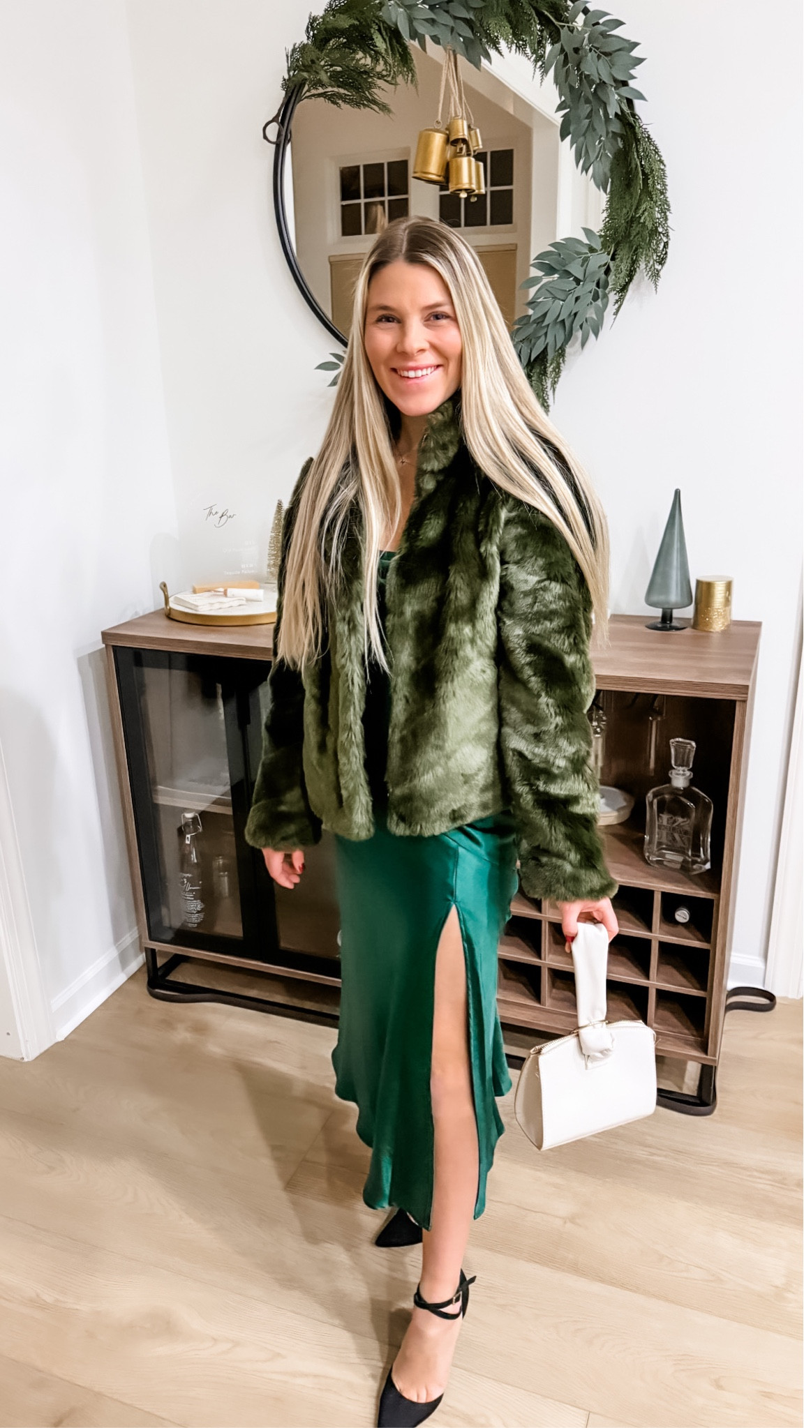 The lush green tones of the fur coat and satin skirt create an elegant monochrome palette, while the skirt’s slit adds a touch of allure. The ensemble is perfectly balanced with classic black heels and a white purse, exuding chic sophistication.