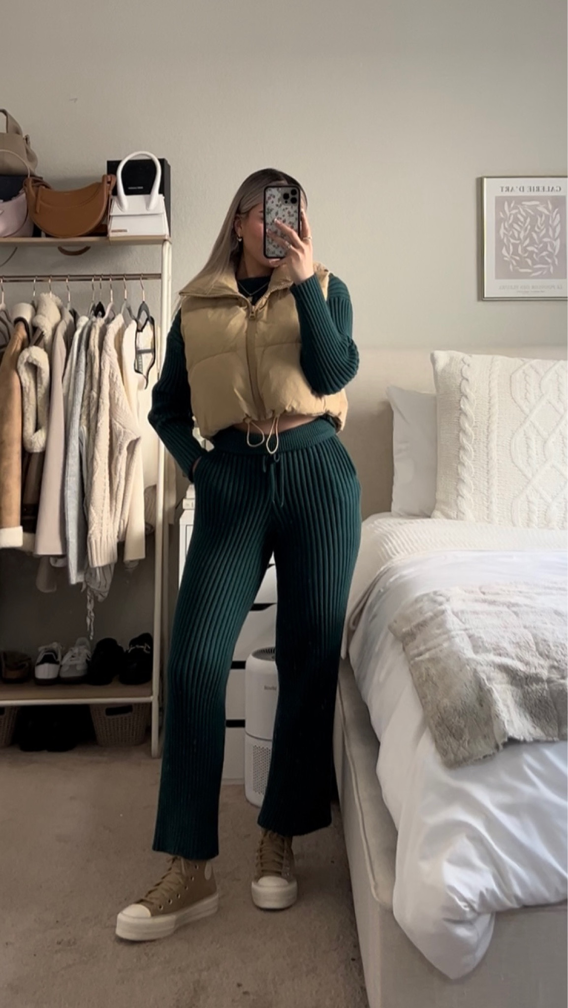 The combination of textures between the quilted vest and ribbed trousers offers a delightful interplay, highlighted by the harmonious color palette. The choice of adding a chunky sneaker provides a casual yet fashionable anchor, completing the look with a nod to sporty chic.