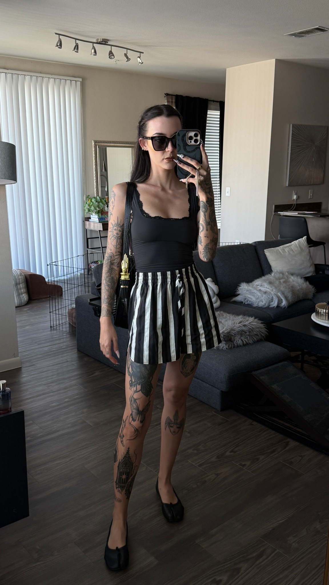– I love the edgy vibe with the leather shorts and bold tattoos; they really stand out.