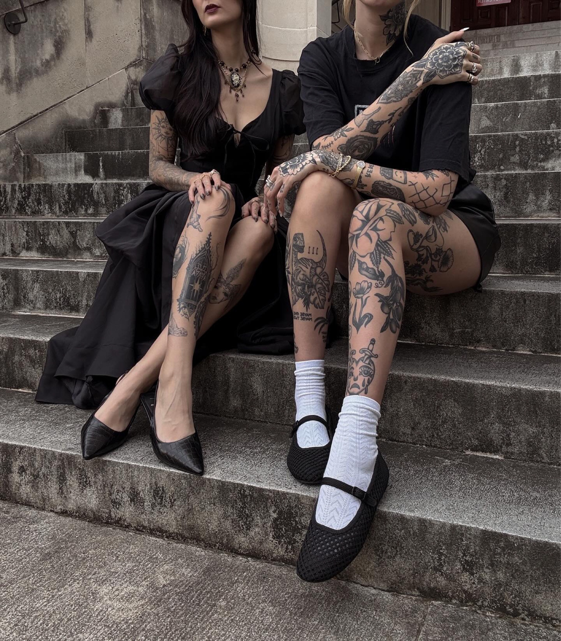 – I love the contrast between the elegant black dress and the casual tattoos; it’s super edgy.