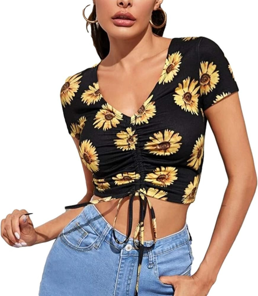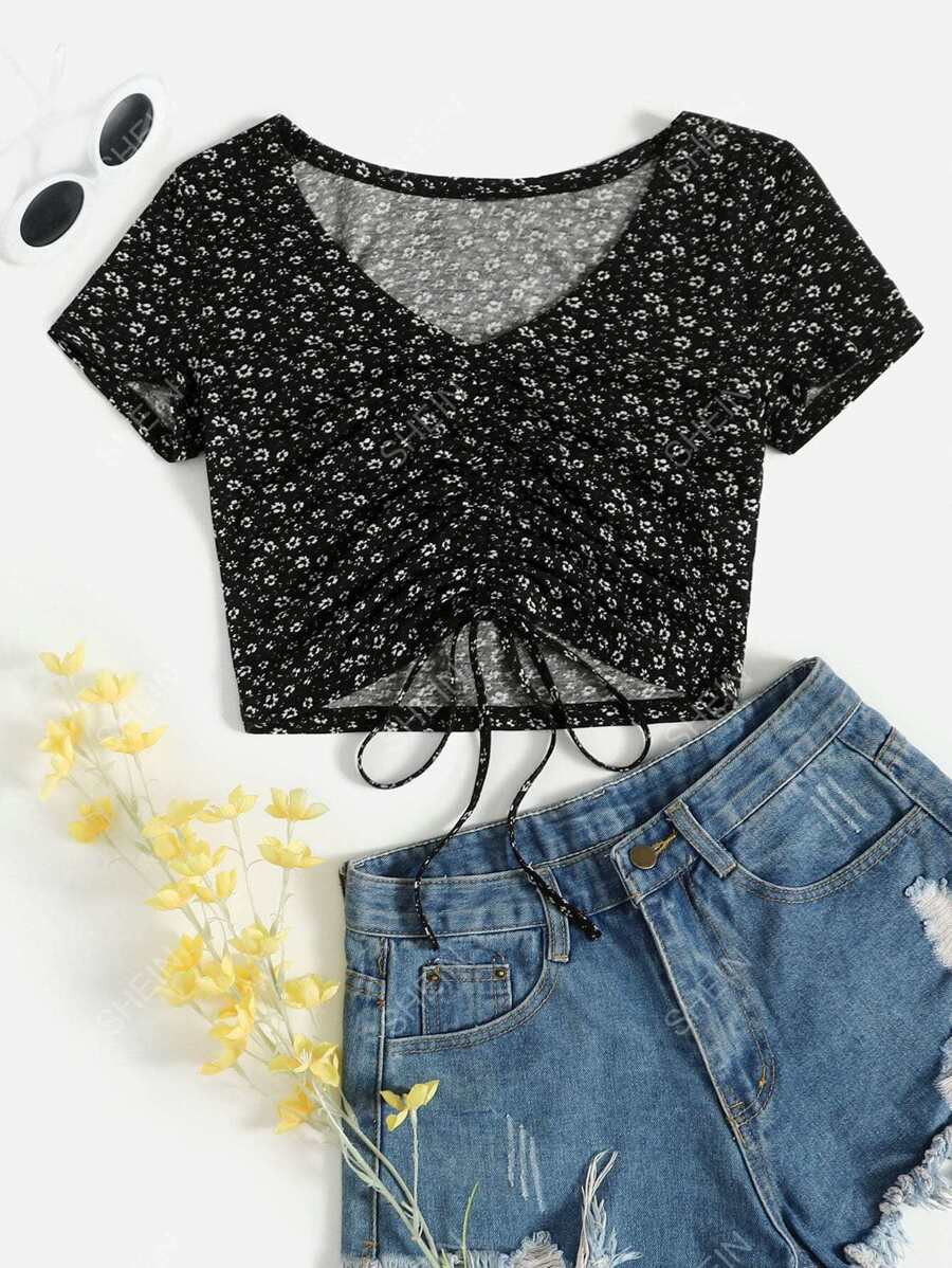 – I love the mix of the floral top with the edgy black shorts; it’s such a cool contrast.