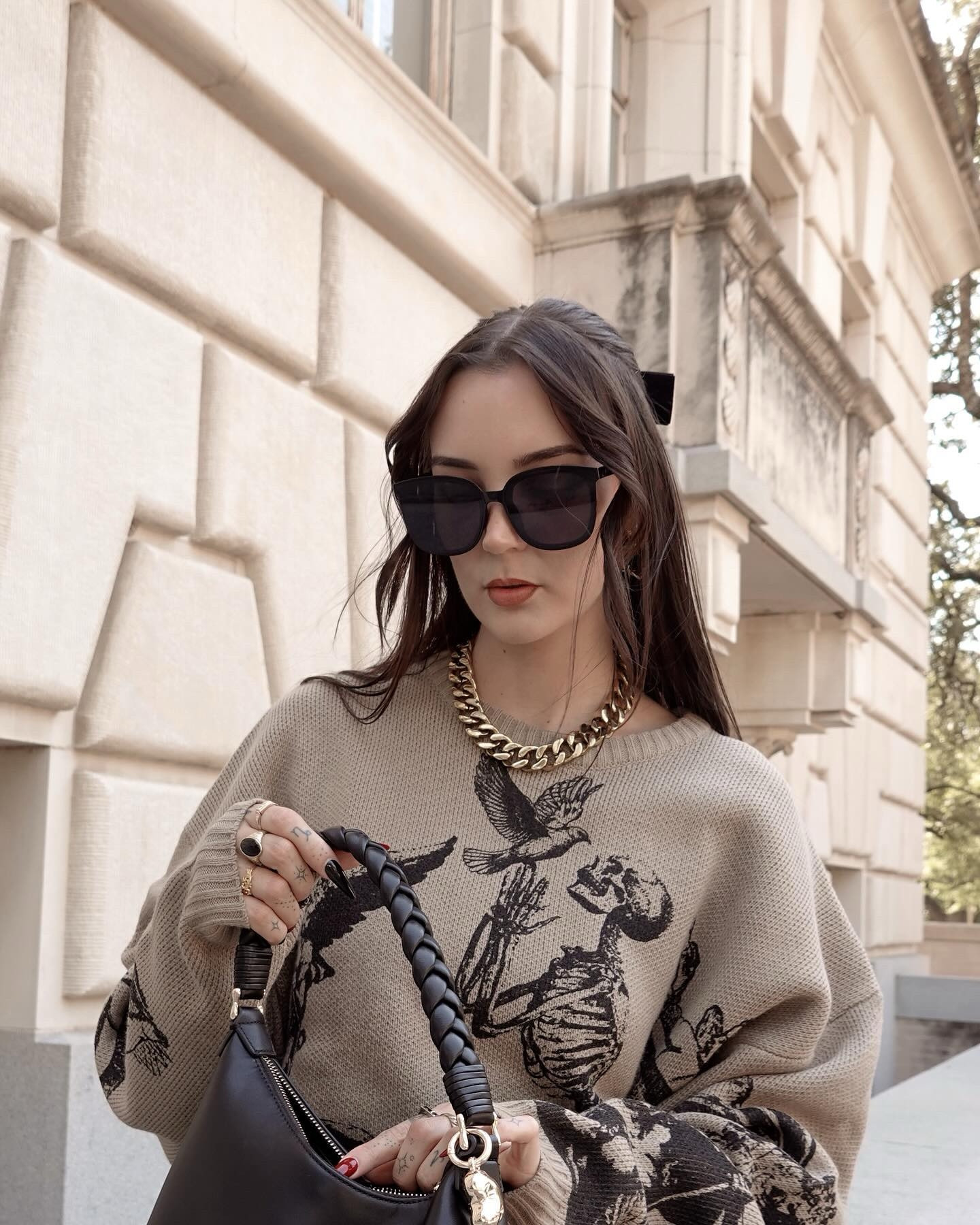 – The chunky gold chain and sleek black sunglasses add a bold, sophisticated touch.