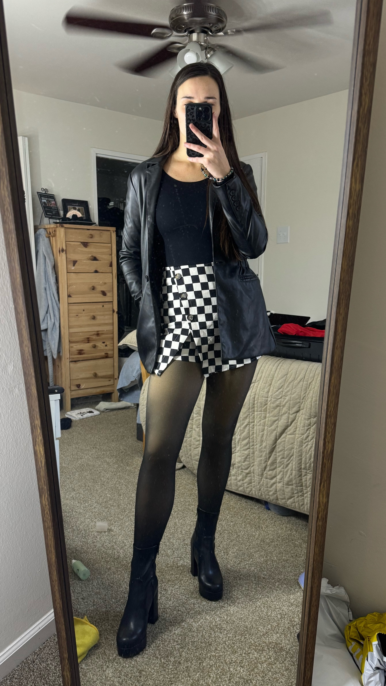 – The leather jacket adds a sleek, edgy vibe that pairs well with the boots.