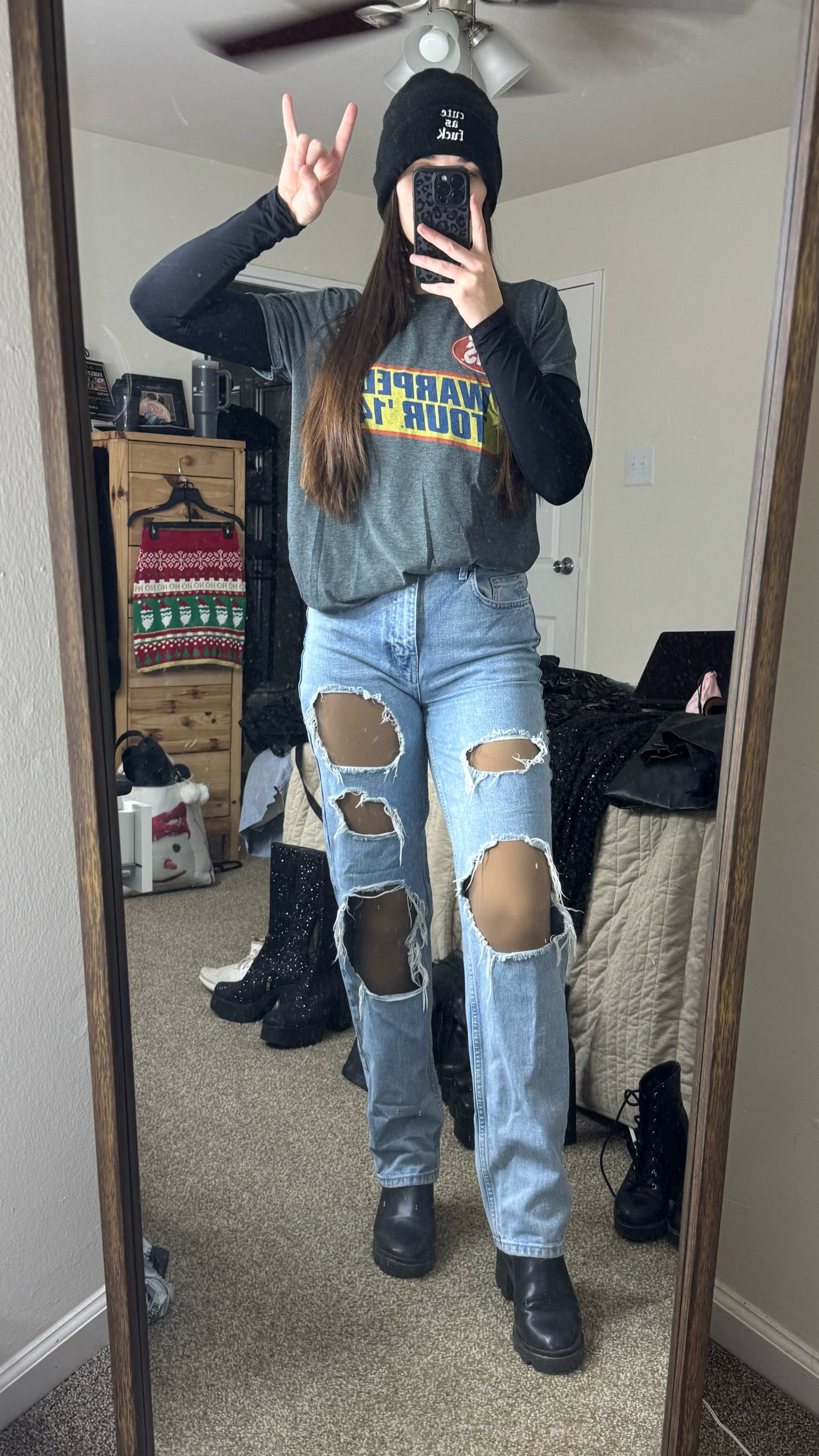 – I love the mix of the band tee with the edgy ripped jeans—it gives off such a fun, laid-back vibe.