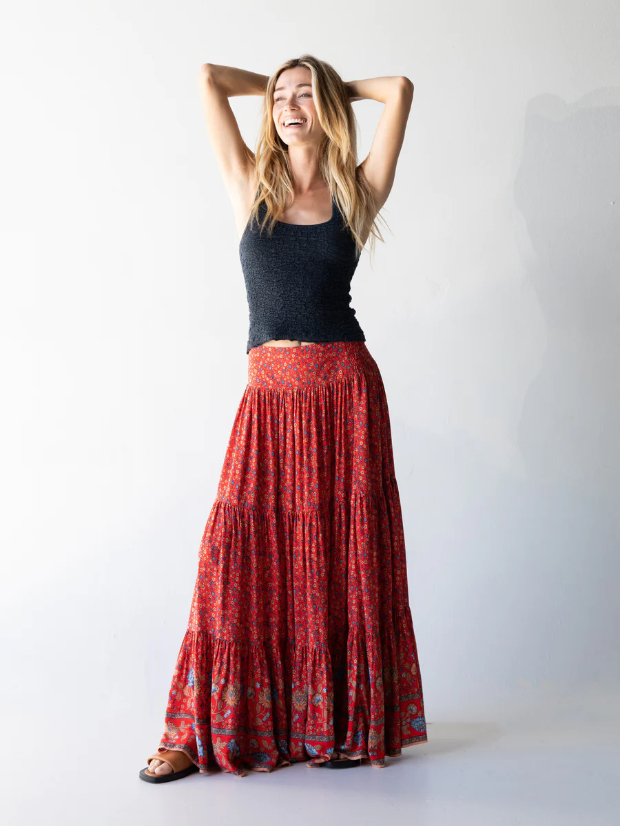 I love how the cheerful red floral skirt brings a vibrant, bohemian flair paired with the elegant simplicity of the white top. The accessory choices, including the headband and jewelry, perfectly complement the overall look, adding a balanced touch of sophistication and playfulness.