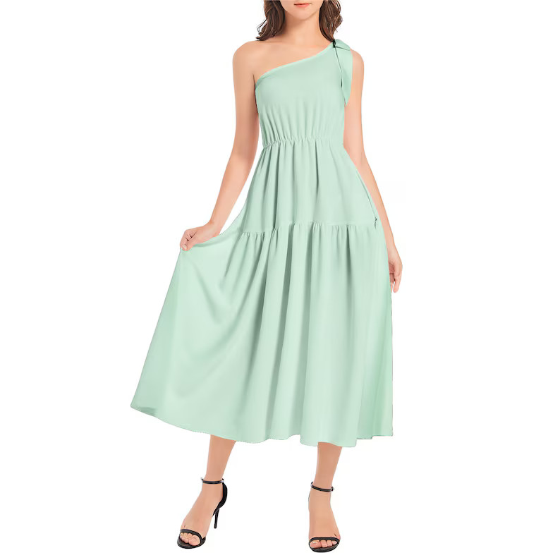 I love this outfit because the lavender floral dress is both feminine and trendy, perfectly complemented by the chic, matching mini handbag. The one-shoulder design adds a modern twist, making it a standout look for any summer outing.