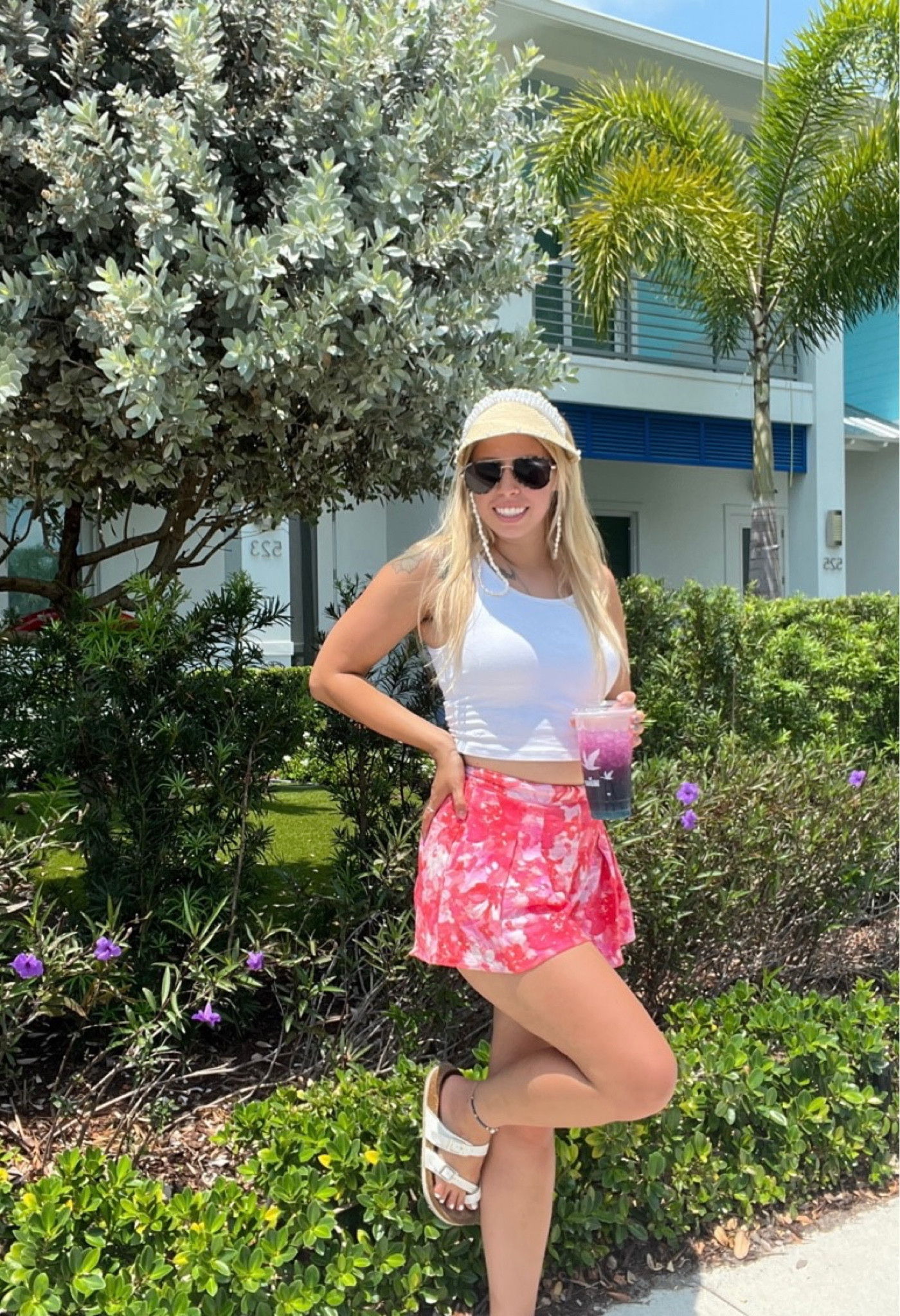 I love how the vibrant floral shorts add a playful pop of color, perfectly balanced by the classic white tank top. The sandals and sunglasses complete the look with a relaxed, summer-ready vibe.