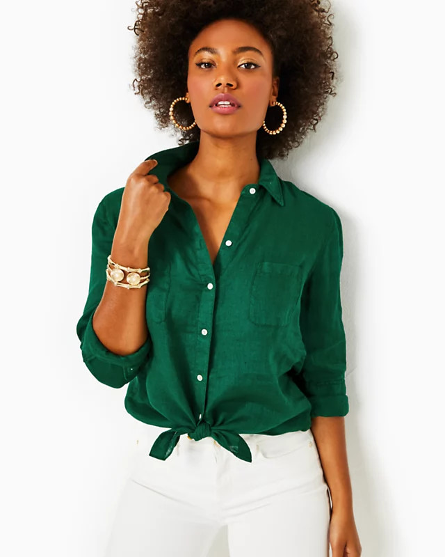 I love the effortless blend of casual and chic in this outfit; the emerald green blouse pairs perfectly with the dark shorts, creating a fresh, balanced look. The white sneakers add a touch of sporty elegance, making it perfect for a relaxed yet stylish day out.
