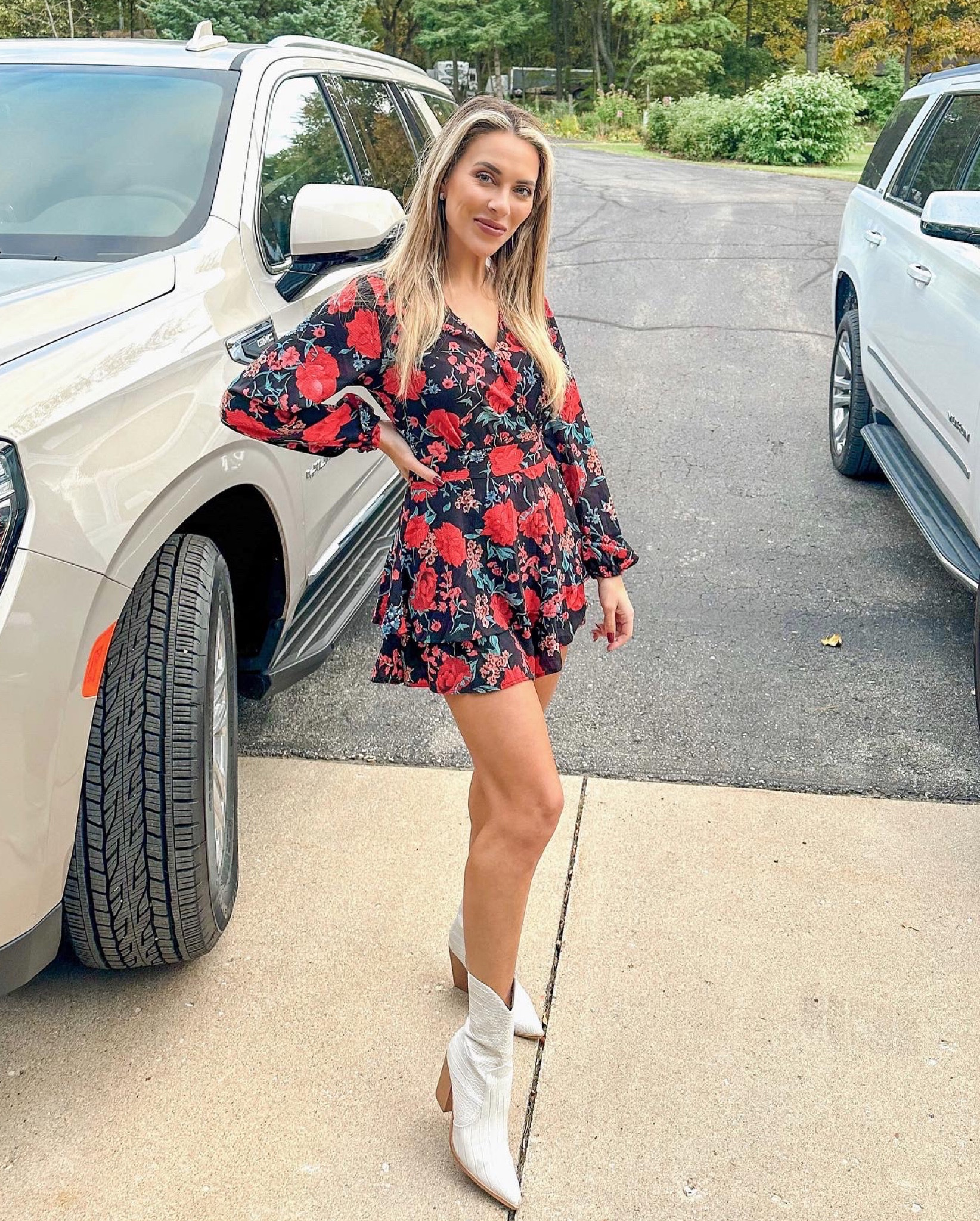 The floral print dress offers a chic, effortless vibe with its flowing silhouette and vibrant pattern, perfect for a smart-casual look. Paired with on-trend white booties, the ensemble is elevated, giving off a touch of modern sophistication.